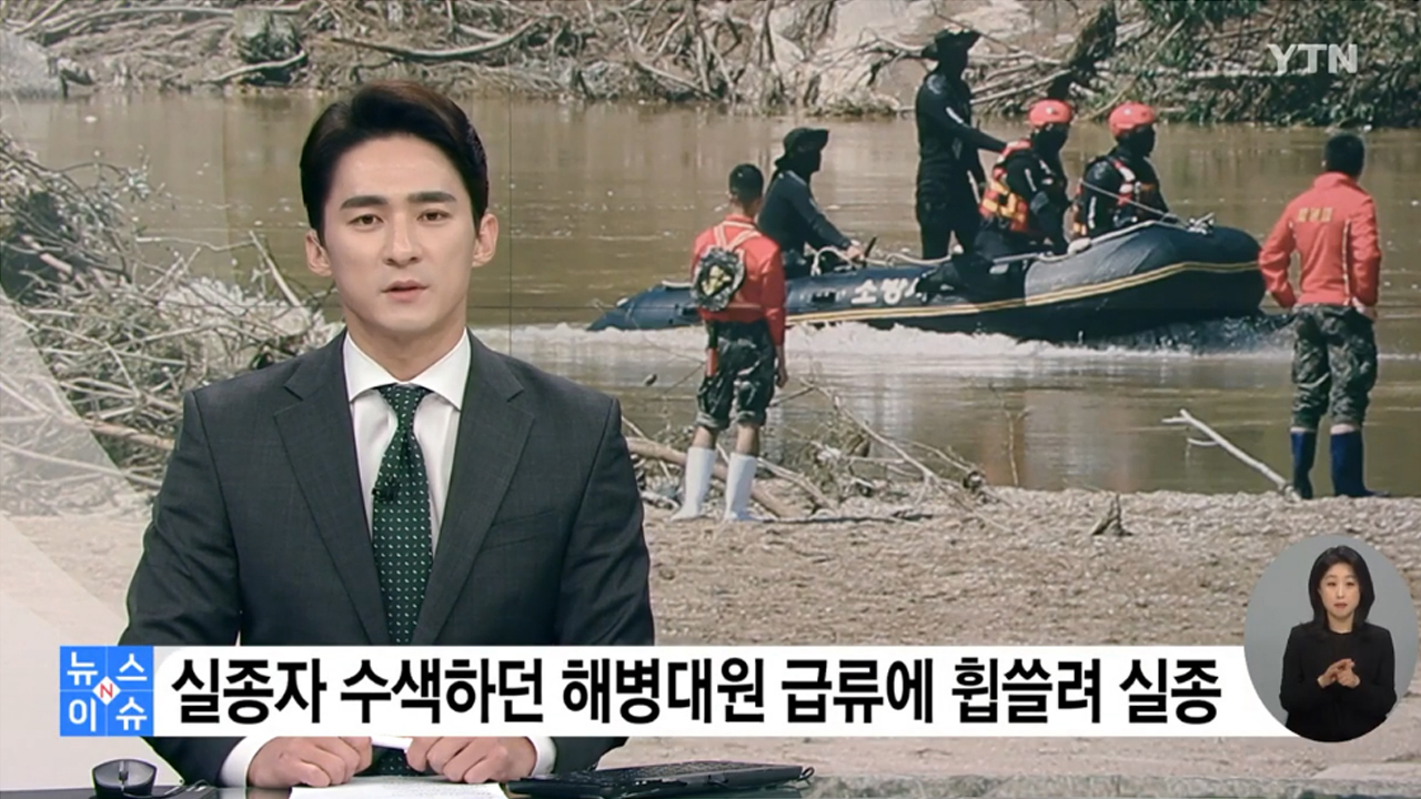 그리고 다음 날인 19일 오전 9시쯤, 예천군에서 들려온 속보. 동료들과 함께 손을 잡고 대열을 맞춰 실종된 주민을 찾기 위해 수색하던 해병대원(채상병) 1명이 급류에 휩쓸려 실종됐다는 뉴스입니다. 실종된 해병대원을 찾기 위해 해병대와 소방당국이 나섰지만 안타깝게도 싸늘한 주검으로 발견됐습니다.
