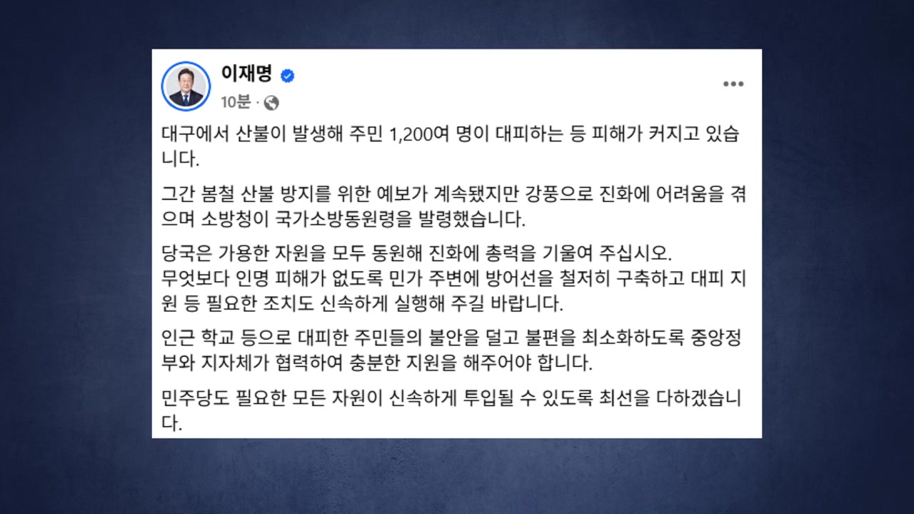 더불어민주당 이재명 대선 후보는 대구에서 산불이 발생해 소방청이 국가 소방동원령을 발령하자, 필요한 모든 자원이 신속하게 투입될 수 있도록 최선을 다하겠다고 밝혔습니다.
