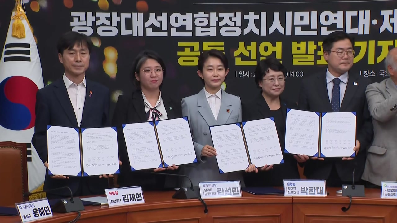 조국혁신당과 진보당, 기본소득당, 사회민주당 등 4개 정당과 '광장대선연합정치 시민연대'는 더불어민주당 이재명 대선 후보 지지를 공식화하고 정권 교체 뒤 개혁 방향을 발표했습니다.