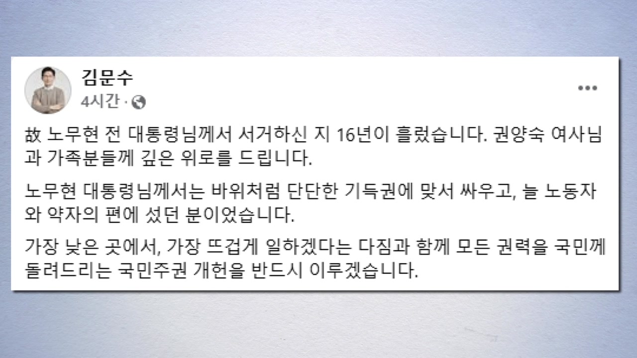국민의힘 김문수 대선 후보는 고 노무현 전 대통령 16주기를 맞아 추모의 뜻을 밝히며 국민주권 개헌을 반드시 이루겠다고 밝혔습니다.