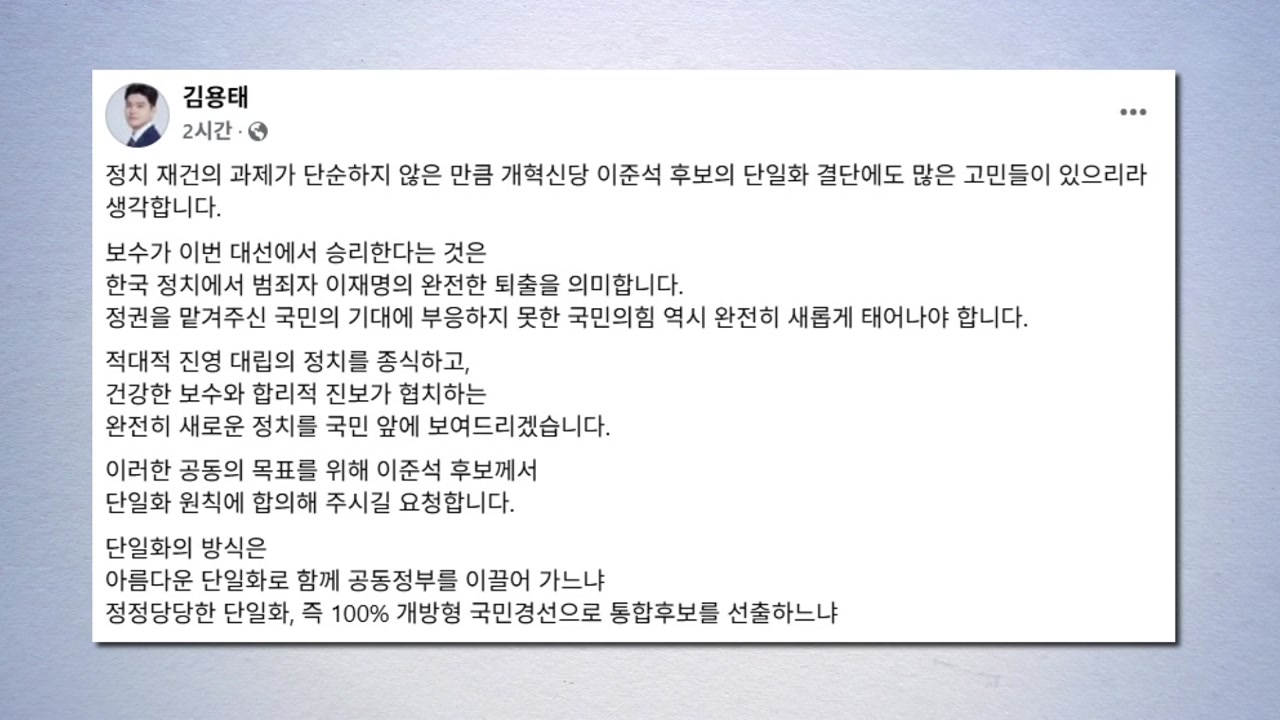 국민의힘 김용태 비상대책위원장은 개혁신당 이준석 후보를 향해, 공동정부 구성 또는 100% 개방형 국민경선이라는 단일화 방식을 제안했습니다.