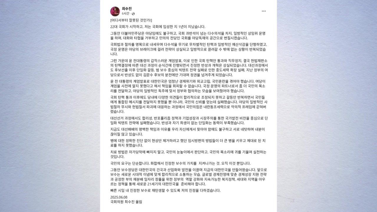 국민의힘 최수진 의원은 개인 SNS에 글을 올려 지난 정부의 여당으로서 반성도 없이 김문수 후보의 분전에만 기대며 정권을 넘겨주게 됐다고 밝혔습니다.
