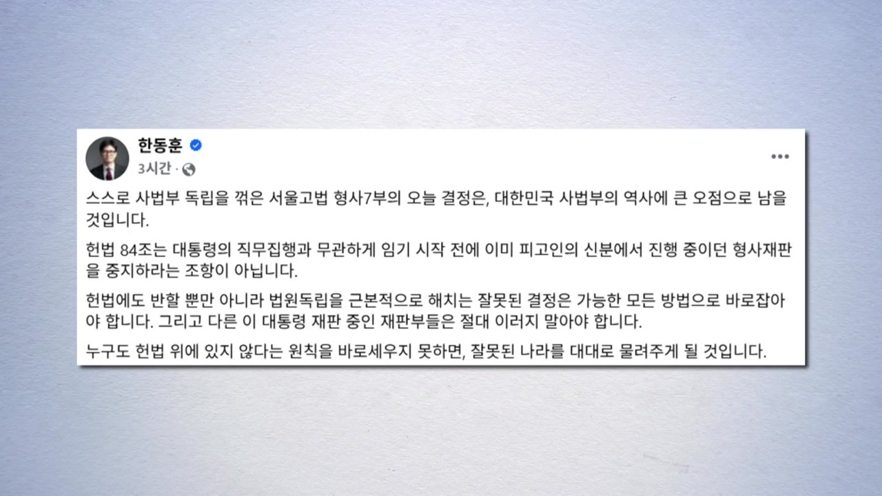 이어 이 대통령 관련 다른 사건의 재판부를 향해서도 절대 이래서는 안 된다며 헌법 84조는 대통령이 임기 시작 전 피고인 신분으로 받던 형사재판을 중지하라는 조항이 아니라고 거듭 강조했습니다.