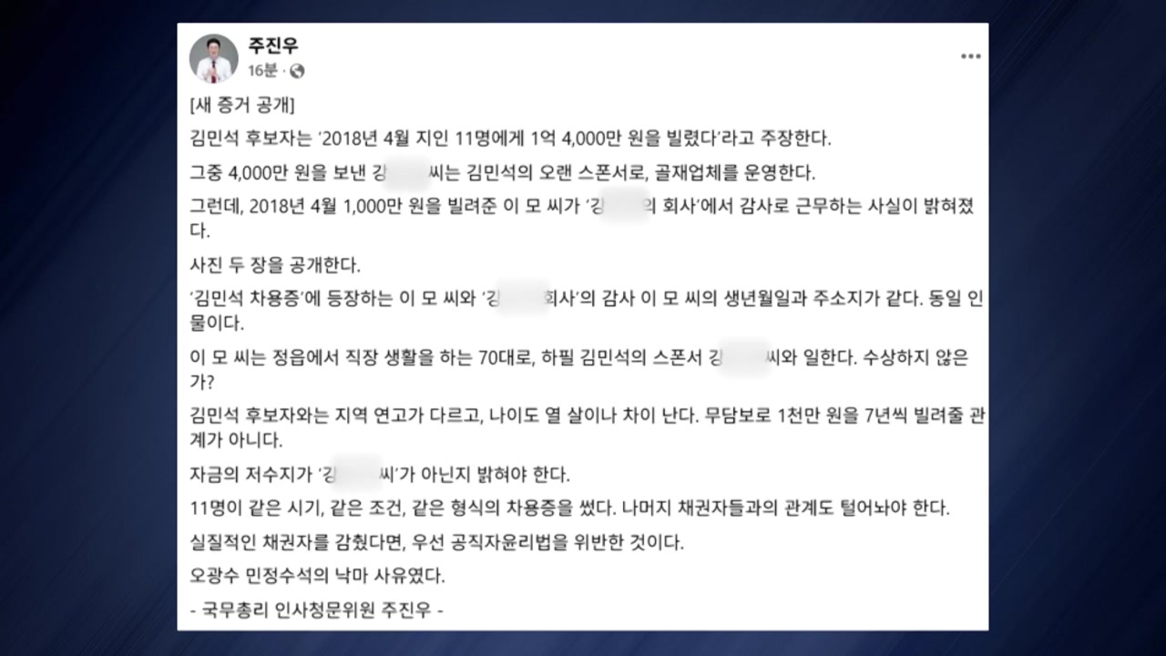 주진우 의원 역시 자신의 SNS에 김민석 후보자가 실제 돈을 빌린 사람을 숨긴 채 허위 차용증을 썼을 수 있다며, 사실이라면 공직자윤리법 위반이 된다고 지적했습니다.