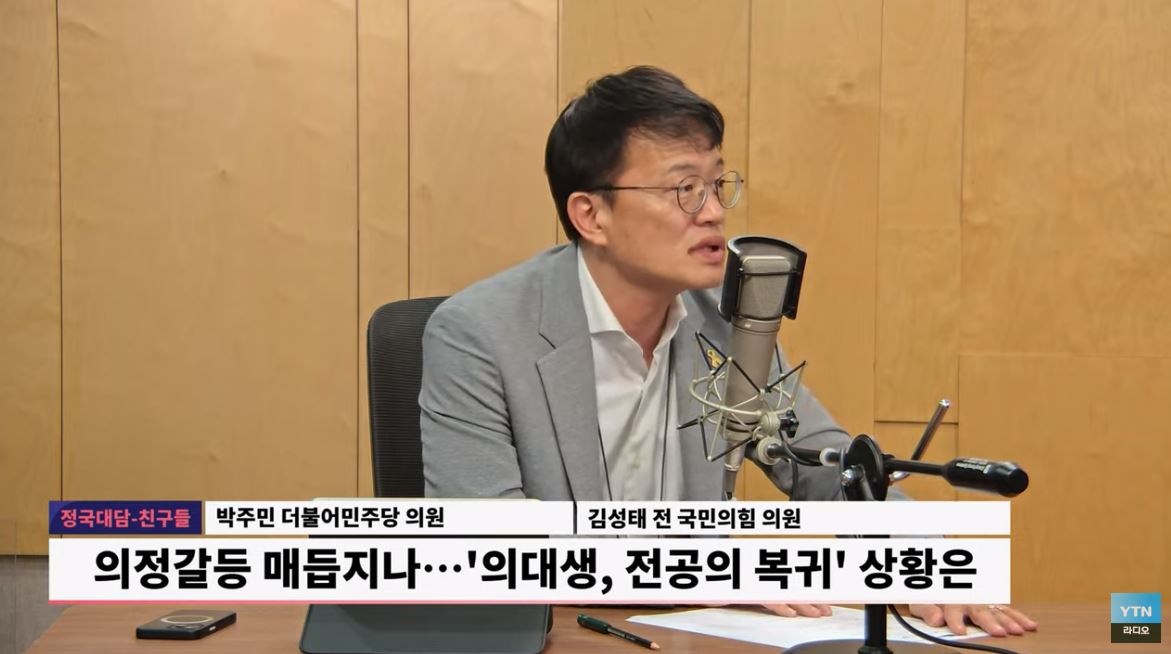 □박주민: 사실은 새로 들어올 친구들이 새로 들어올 학생분들이 수업에 있어서 학점을 더 적게 이수한다든지 또는 시간을 더 적게 수업을 받는다든지 이런 것은 없는 것으로 했습니다. 수업과 학점의 총량에 있어서는 동일하다 이런 말씀을 드리겠고요. 그렇기 때문에 전에도 제가 다른 인터뷰에서 말씀드린 것처럼 원래 오히려 윤석열 정부에서는 수업 시간이나 학점을 줄여서라도 학년으로 진급시켜주겠다고 얘기했었던 거거든요. 그런데 그런 혜택은 없다라는 말씀을 드리겠고 다만 아무래도 미리부터 공부하고 있었던 분들에 비하면 들어오는 분들 뭔가 조치가 있어야 되는 거 아니냐는 국민적 감정은 저도 충분히 이해합니다. 그런데 지금 상황은 의사가 평상시에 1년에 3천 명 정도 배출되는 데다가 지금은 거의 한 250명대로 배출되고 있어요. 격오지라든지 군의관 이런 데 격오지에 가야 될 공보의나 군대에 갈 군의관의 경우에는 굉장히 어렵고 힘든 상황이고 국민 건강 자체가 심각하게 위협을 받고 있는 상황이라서요. 이분들을 복귀시켜서 의사 배출에는 지장이 없도록 해야 되는 측면도 있다는 점을 감안해 주셨으면 합니다.