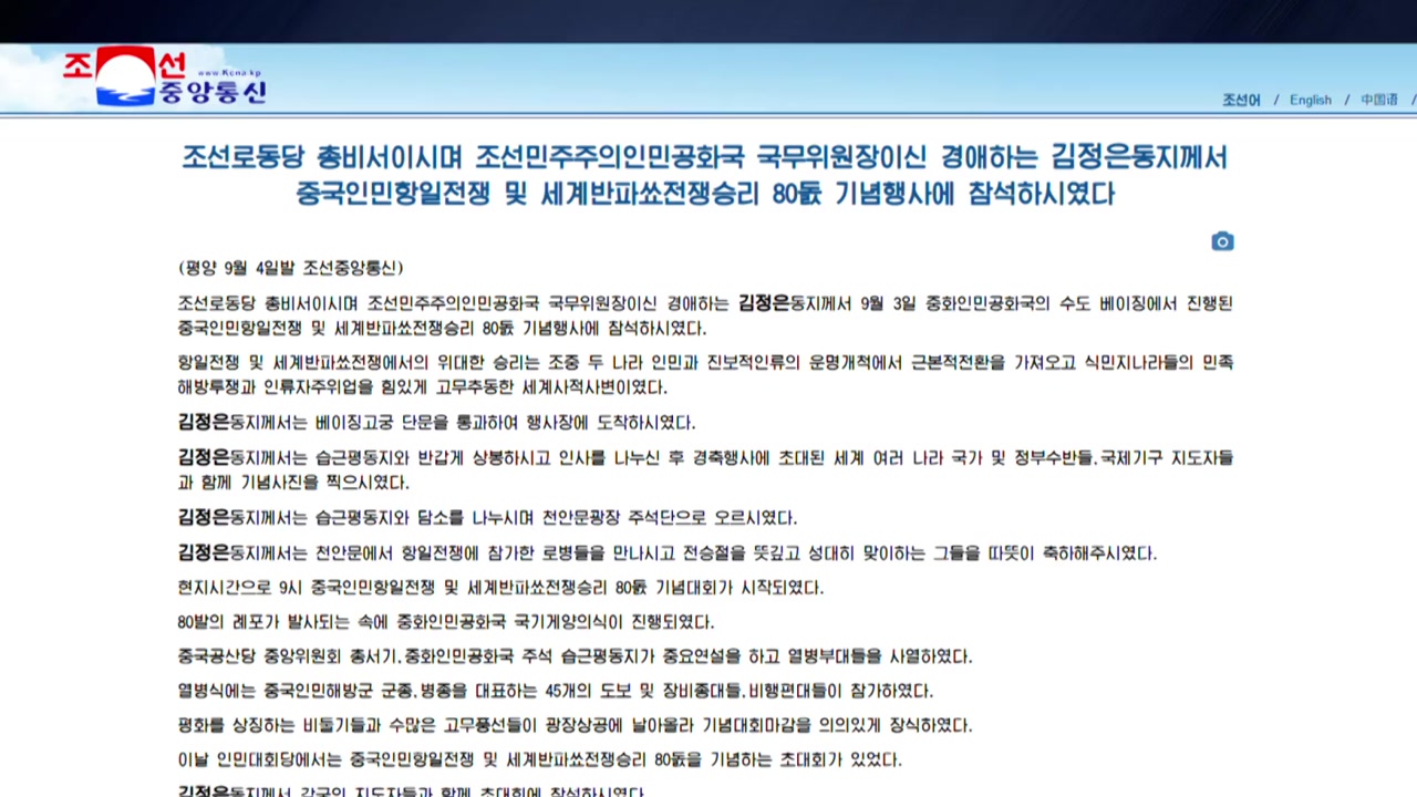 북한 매체들은 김정은 국무위원장이 어제 중국 전승절 80주년 열병식에 참석한 모습을 대대적으로 보도했습니다.