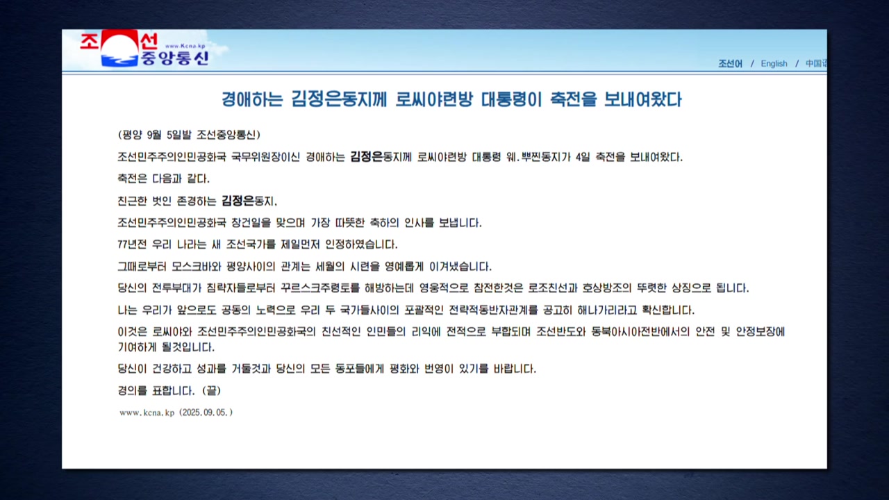 조선중앙통신은 푸틴 대통령이 오는 9일 북한 정권 수립 77주년을 앞두고 어제 김 위원장에게 축전을 보냈다고 보도했습니다.