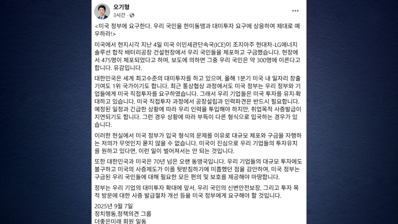 그러면서 우리 정부를 향해 우리 국민의 신변안전보장, 투자 목적 방문에 대한 사증 발급 절차 개선 등을 미국 측에 요구해야 한다고 촉구했습니다.
