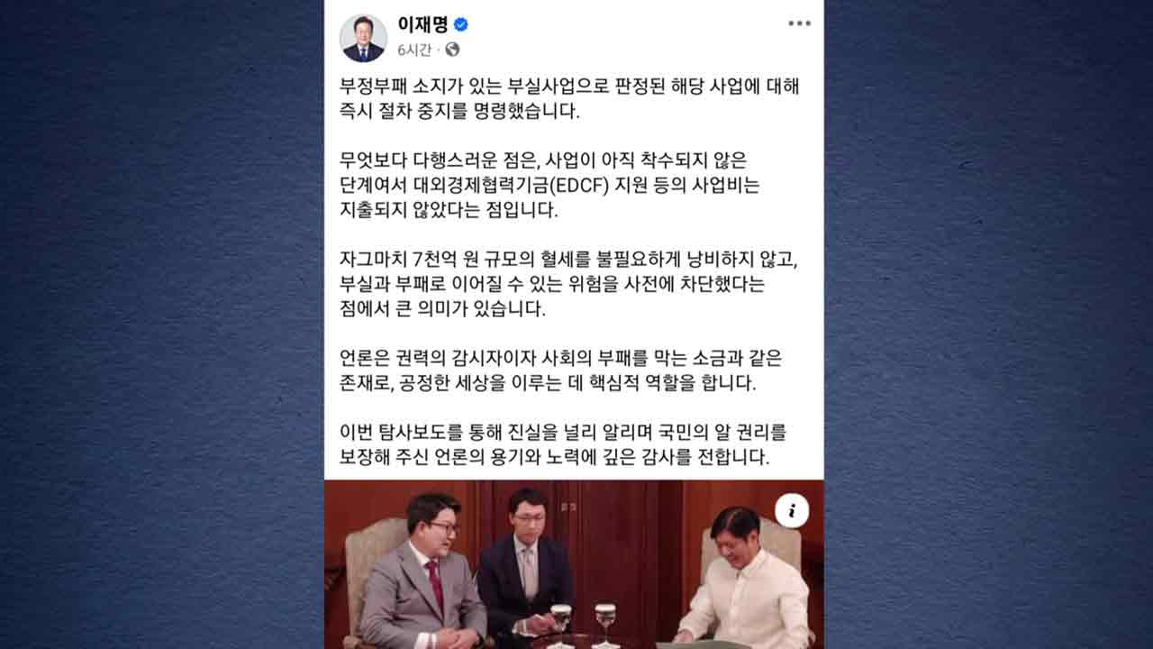 이 대통령은 SNS에 관련 기사를 올려, 다행스러운 점은 사업이 아직 착수되지 않은 단계여서 대외경제협력기금 지원 등 사업비가 지출되지 않았다며 이같이 말했습니다.