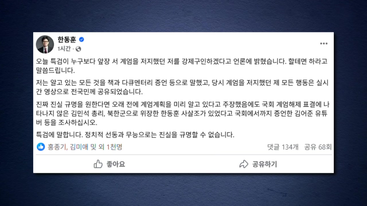 한 전 대표는 오늘(12일) SNS에 특검이 누구보다 앞장서 계엄을 저지했던 자신을 강제구인하겠다고 언론에 밝혔다면서 이같이 전했습니다.
