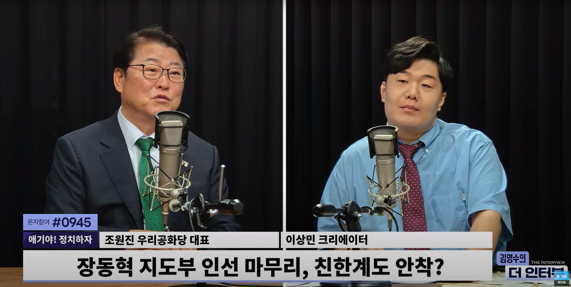 ◆ 김영수 : 정치 고수와 신선한 시선이 만나는 본격 시사토크 애기야 정치하자. 월요일 순서죠. 이번 주 정치 고수는 우리 공화당 조원진 대표입니다. 이상민 크리에이터와 함께 하겠습니다. 어서 오십시오. 우리 공화당 조원진 대표께는 장동혁 대표 체제에 대해서 물어보겠습니다. 장동혁 대표가 지도부 인선을 마무리했는데 지도부 인선 총평 해주세요. 어떻게 보셨어요?