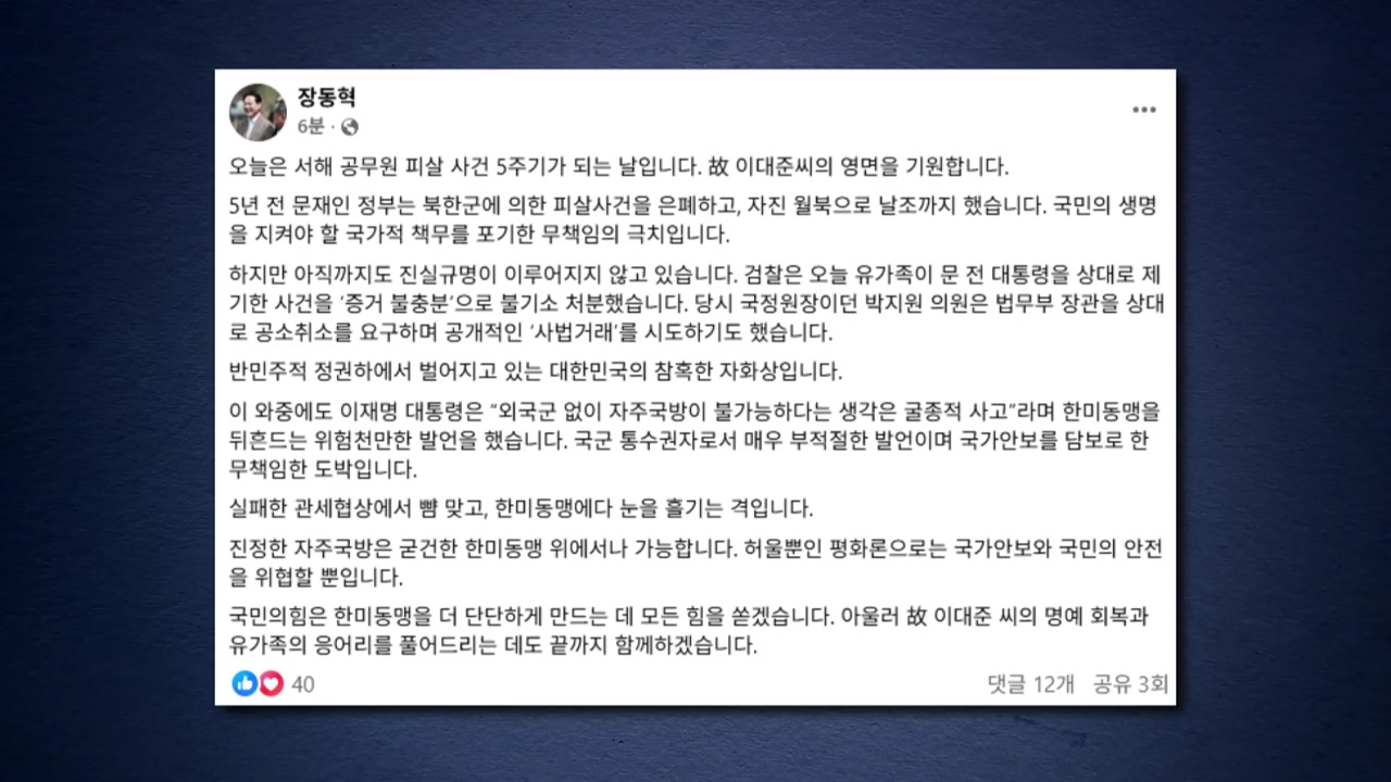 장 대표는 오늘(22일) SNS에 5년 전 문재인 정부가 북한군에 의한 고 이대준 씨 피살사건을 은폐하고, 자진 월북으로 날조까지 했는데 아직도 진실 규명이 이뤄지지 않고 있다며 이같이 적었습니다.