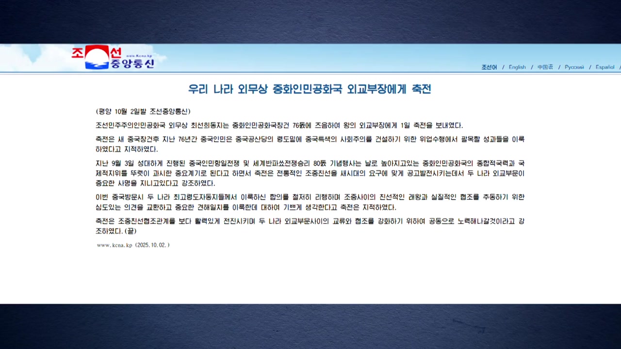 최선희 북한 외무상이 중국 국경절 76주년을 맞아 왕이 중국 외교부장에게 축전을 보내 교류와 협조 강화를 강조했다고 조선중앙통신이 보도했습니다.