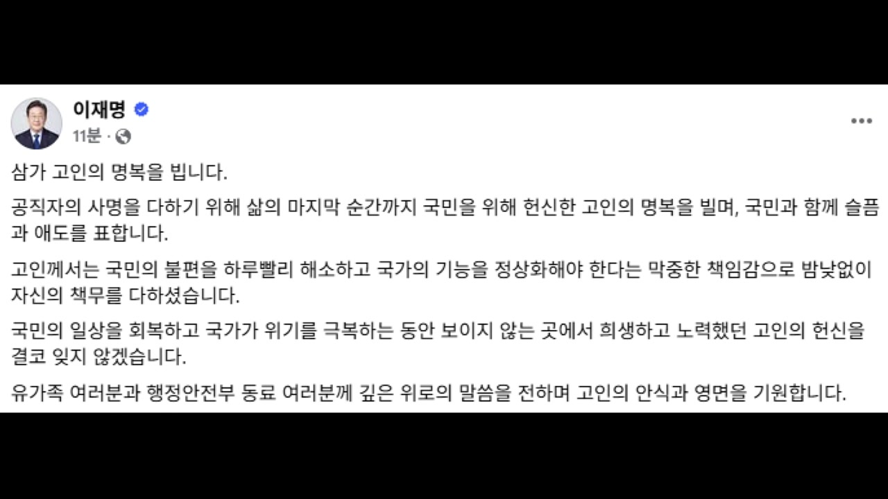 이재명 대통령은 국가전산망 장애 관련 업무를 담당해 온 행정안전부 공무원이 사망한 사건을 두고, 고인의 명복을 빌며 국민과 함께 슬픔과 애도를 표한다고 밝혔습니다.