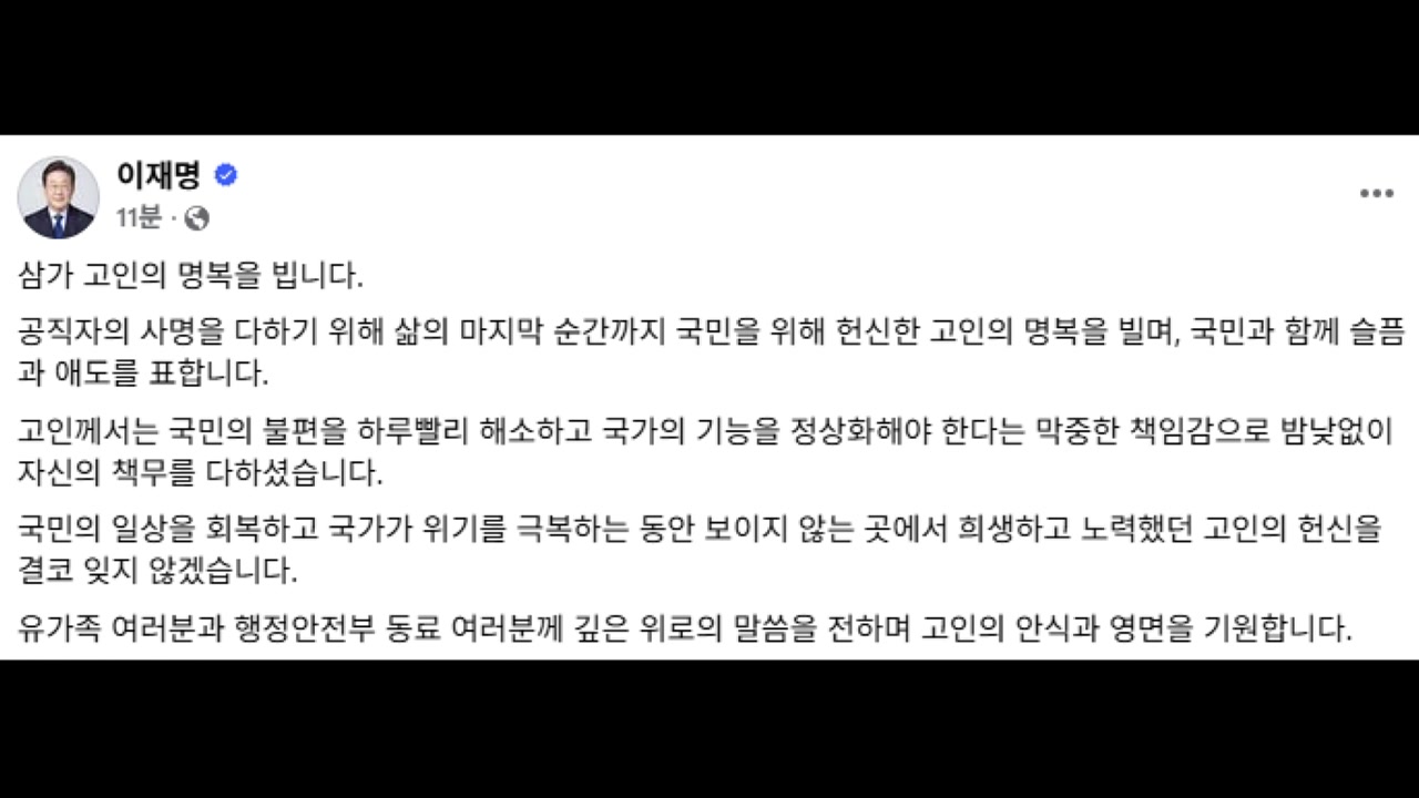 그러면서 유가족과 행정안전부 동료 여러분께도 깊은 위로의 말을 전하며, 고인의 안식과 영면을 기원한다고 덧붙였습니다.