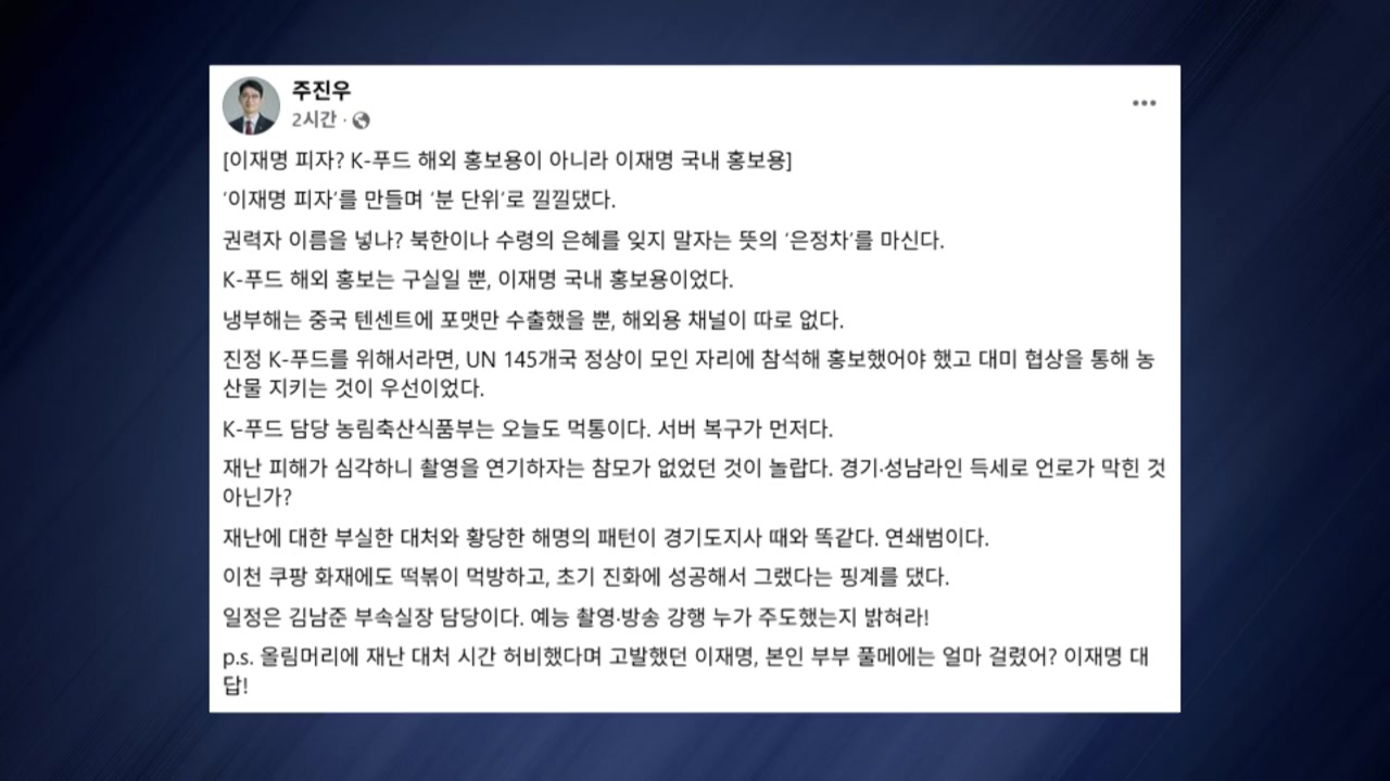국민의힘 주진우 의원이 이재명 대통령 내외의 '냉장고를 부탁해' 예능 출연을 두고, K-푸드 해외 홍보용이 아니라 대통령 국내 홍보용 방송이었다고 혹평했습니다.