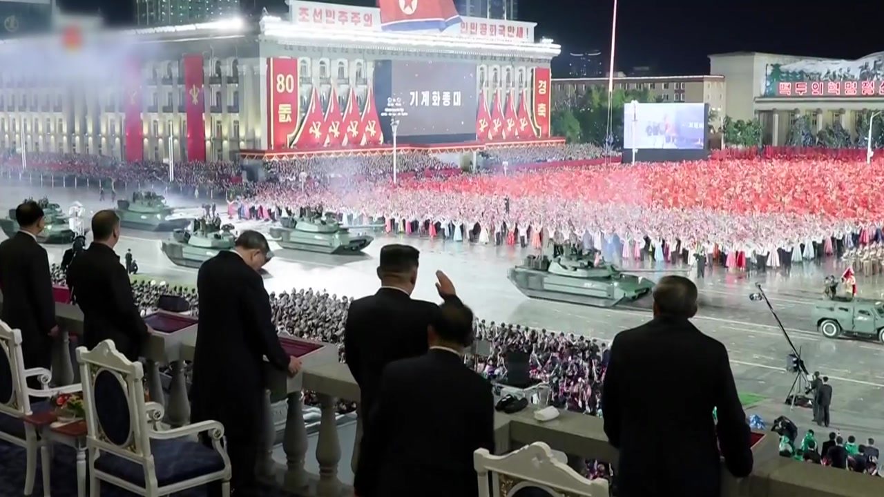 [조선중앙TV : 김정은 동지께서는 열병식이 끝난 후 여러 나라 당 및 정부 수반들과 작별하시었습니다.]