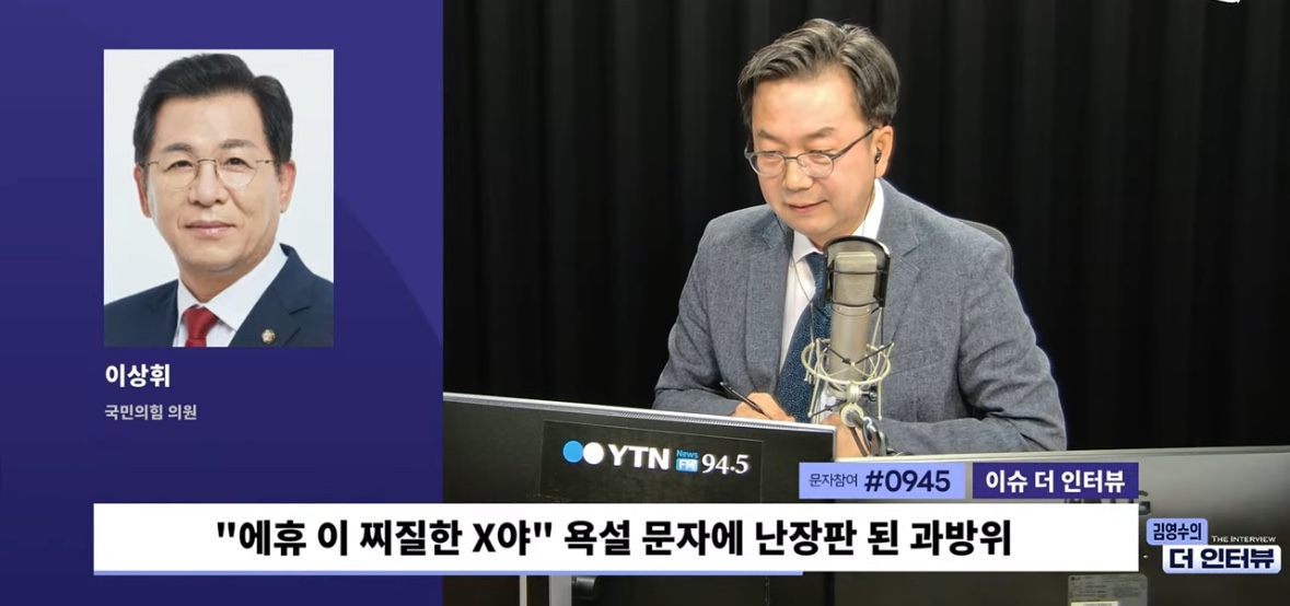 ◆김영수 앵커(이하 김영수): 오늘 이슈 인터뷰 1부는 국민의힘 이상휘 의원입니다. 언론인 출신으로 국민의힘 홍보본부장 지냈고 포항이 지역구입니다. 의원님, 나와 계시죠?