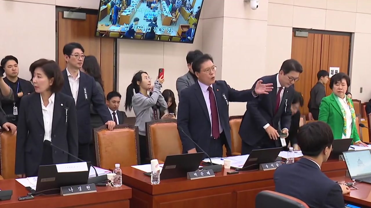 여야 의원들은 나란히 기자회견을 열어 사과도 요구했습니다, 방금 감사가 재개됐지만 여전히 고성이 오가고 있습니다.
