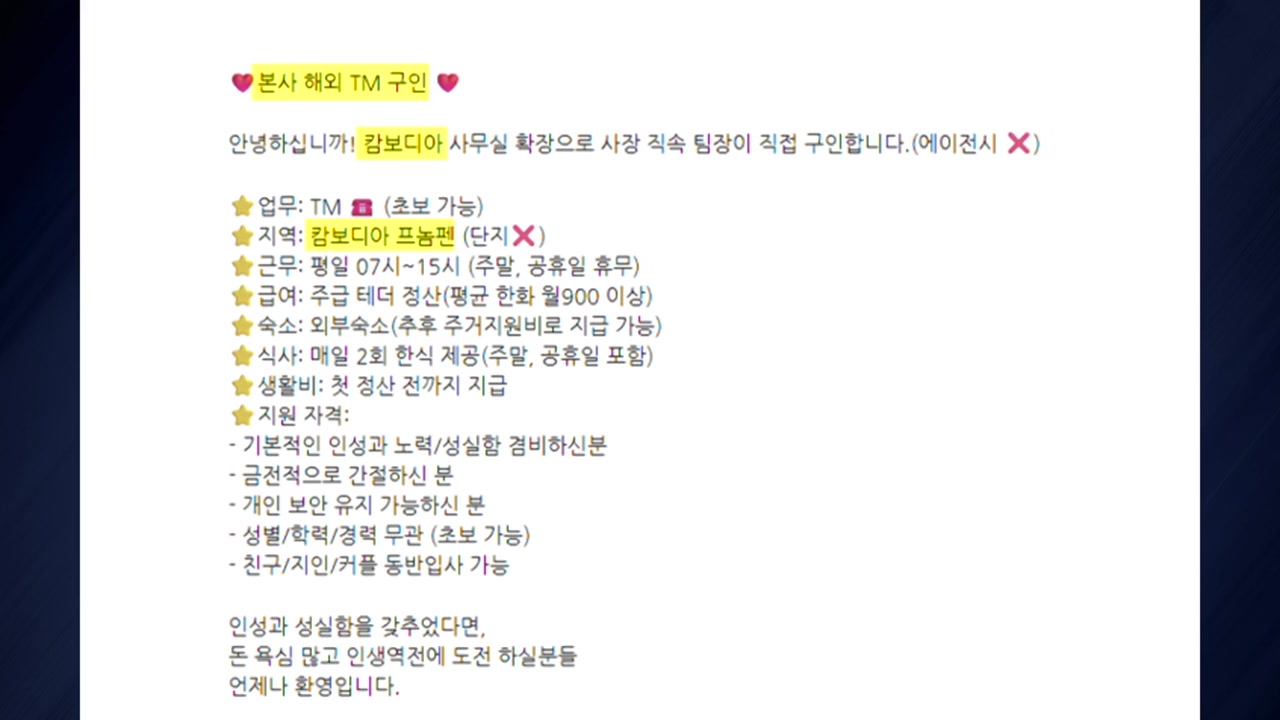 광고에 속아 캄보디아로 갔다가 감금과 납치 등 범죄 피해를 보는 사례가 잇따르고 있다는 판단에 따른 거로 보입니다.