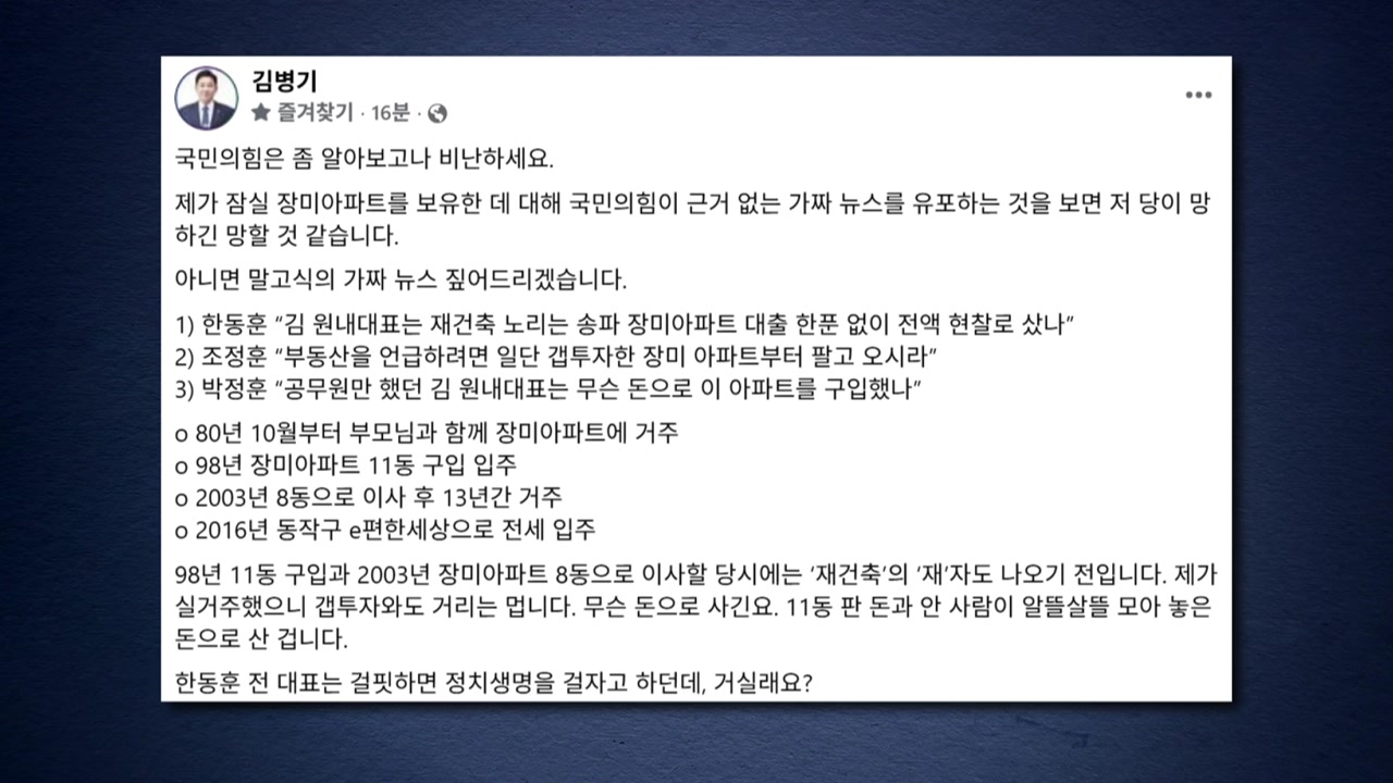김 원내대표는 어제(16일) 자신의 SNS에 지난 1998년 처음 아파트 한 채를 샀고, 2003년 다른 동으로 이사할 땐 재건축의 '재' 자도 나오기 전이었다며, 실거주했으니 '갭 투자'와도 거리가 멀다고 해명했습니다.