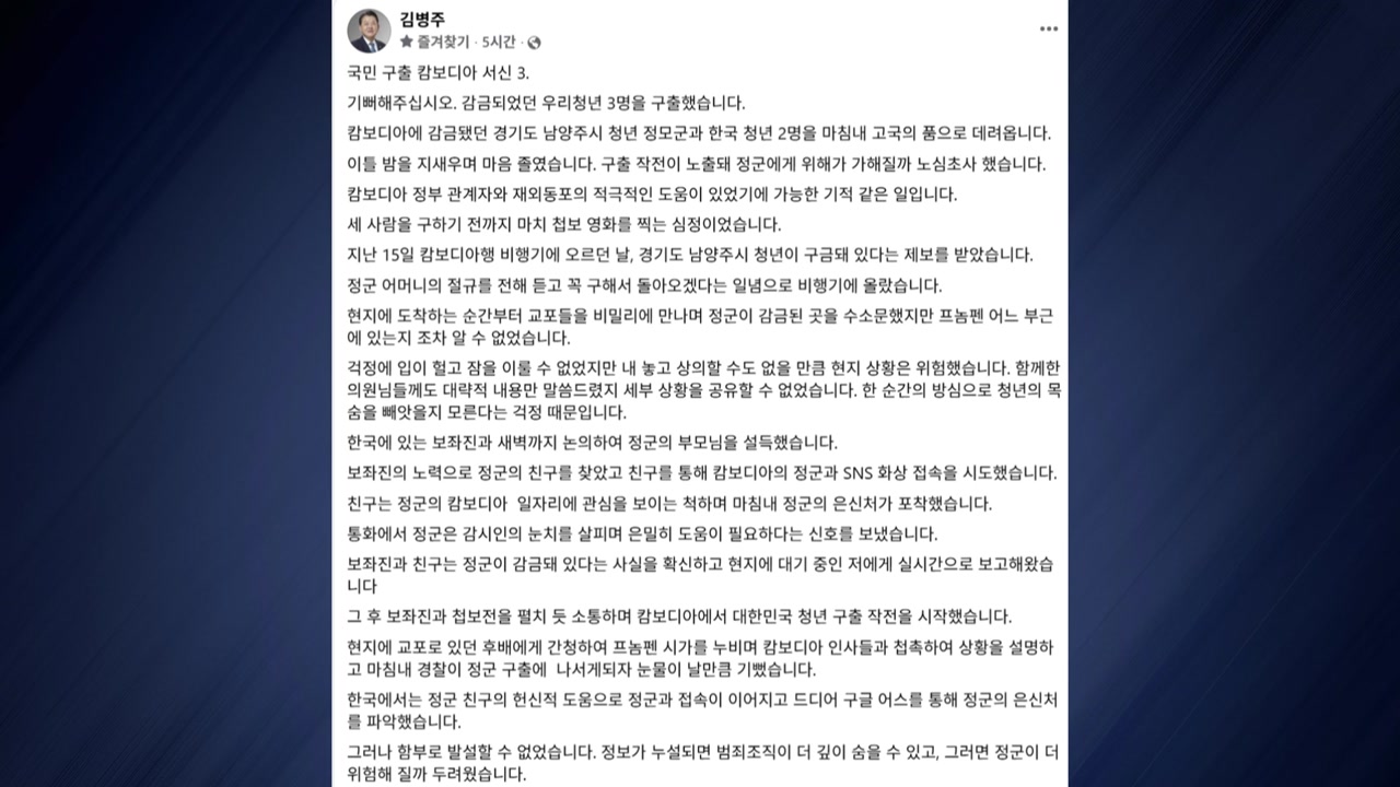 한국인 납치·감금 사태 대응을 위해 캄보디아로 급파된 더불어민주당 김병주 최고위원이 감금됐던 한국인 청년 3명을 구출했다고 밝혔습니다.