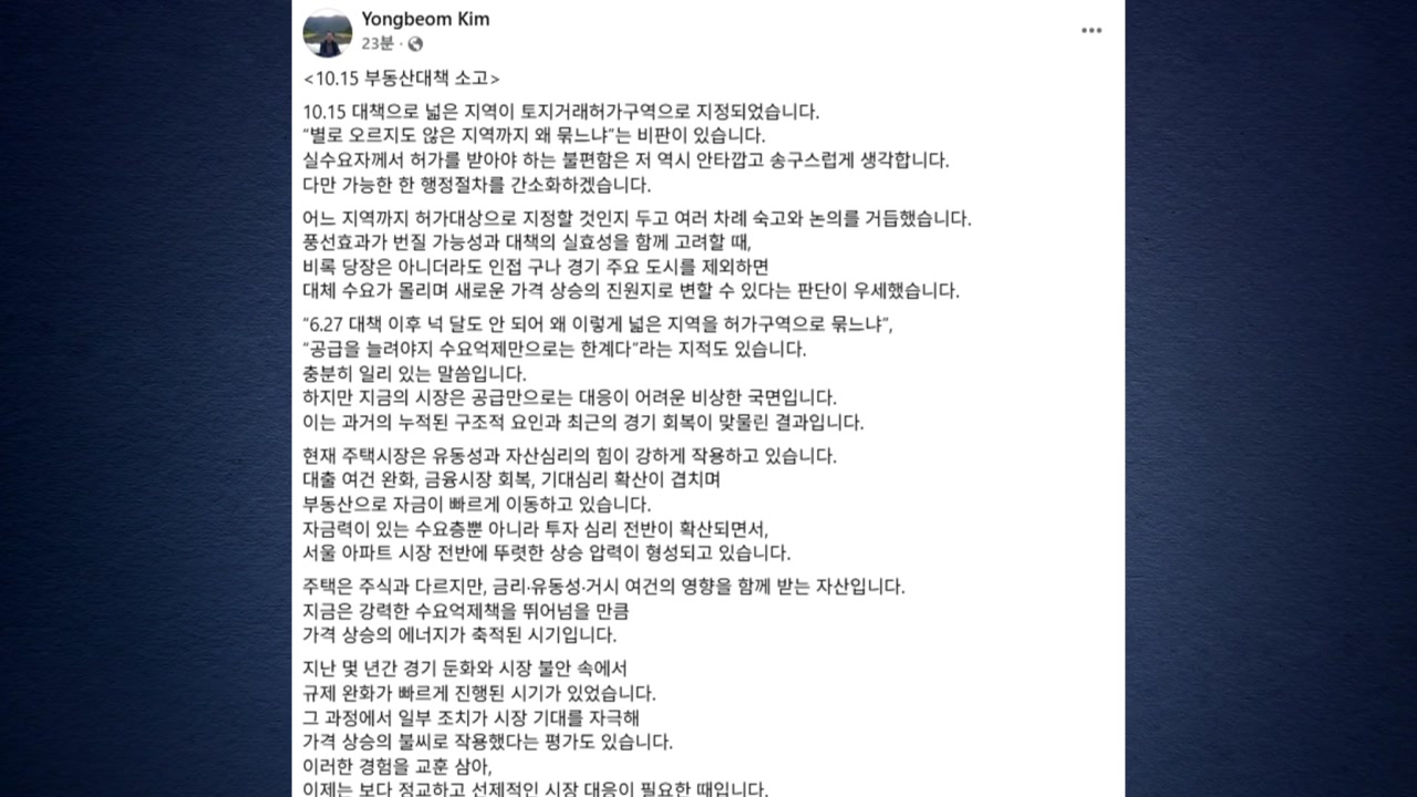 김 실장은 오늘(19일) 밤 자신의 SNS에 올린 글에서, 어느 지역까지 허가대상으로 지정할 것인지를 두고 숙고와 논의를 거듭했다며 이같이 적었습니다.
