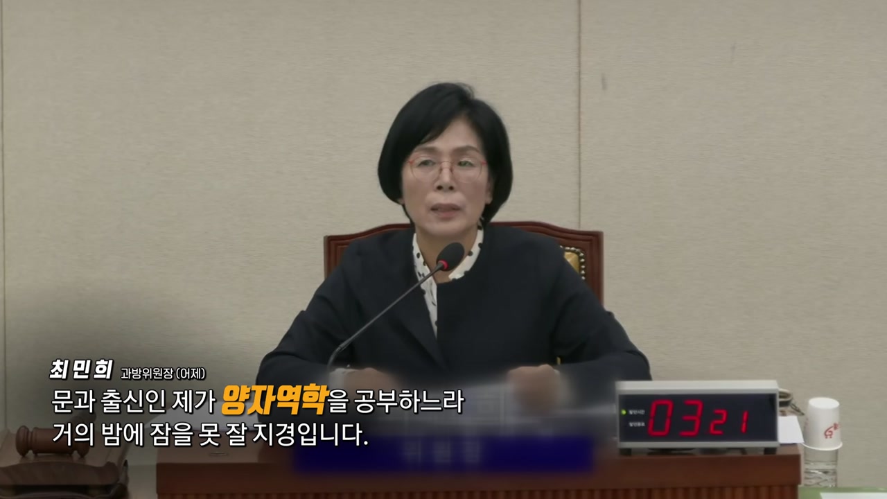 [최 민 희 / 과방위원장, 어제 : 문과 출신인 제가 양자역학을 공부하느라 거의 밤에 잠을 못 잘 지경입니다. 매일매일 양자역학 공부하고 내성 암호 공부하고, 암호 통신을 거의 외우다시피 합니다. (중략) 정말 집안일이나 딸의 결혼식에 신경을 못 썼습니다.]