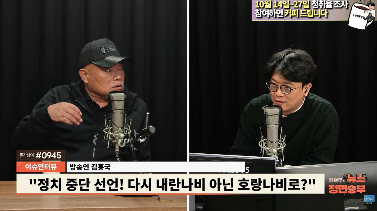 ●김흥국: 아니 제가 본업으로 돌아가겠다, 이게 이 정치는 내가 갈 길이 아니다, 내가 가수니까 가수면 노래 해야 되고 방송해야 되고 뭐 예능 해야 되겠다, 이렇게 제가 선언을 했으면 그 사람들도 ‘아니 저 형 왜 그래 갑자기’ ‘무슨 뭐 신변에 뭘 느꼈네’ 뭐 할 수 있잖아요. 그러면 나란 사람의 그 생각 마음을 잘 알고 아 나도 그만 해야겠다, 이건 무슨 보장도 없고 뭐 아무 무책임한데 이걸 내가 괜히 뭐라 그럴까? 아니 집구석 들어가도 불편해요. 지금 집구석도 나란 사람을 내가 진짜 이 생방에 말 조심해야 되는데 집에서도 인기 다 떨어졌어요.