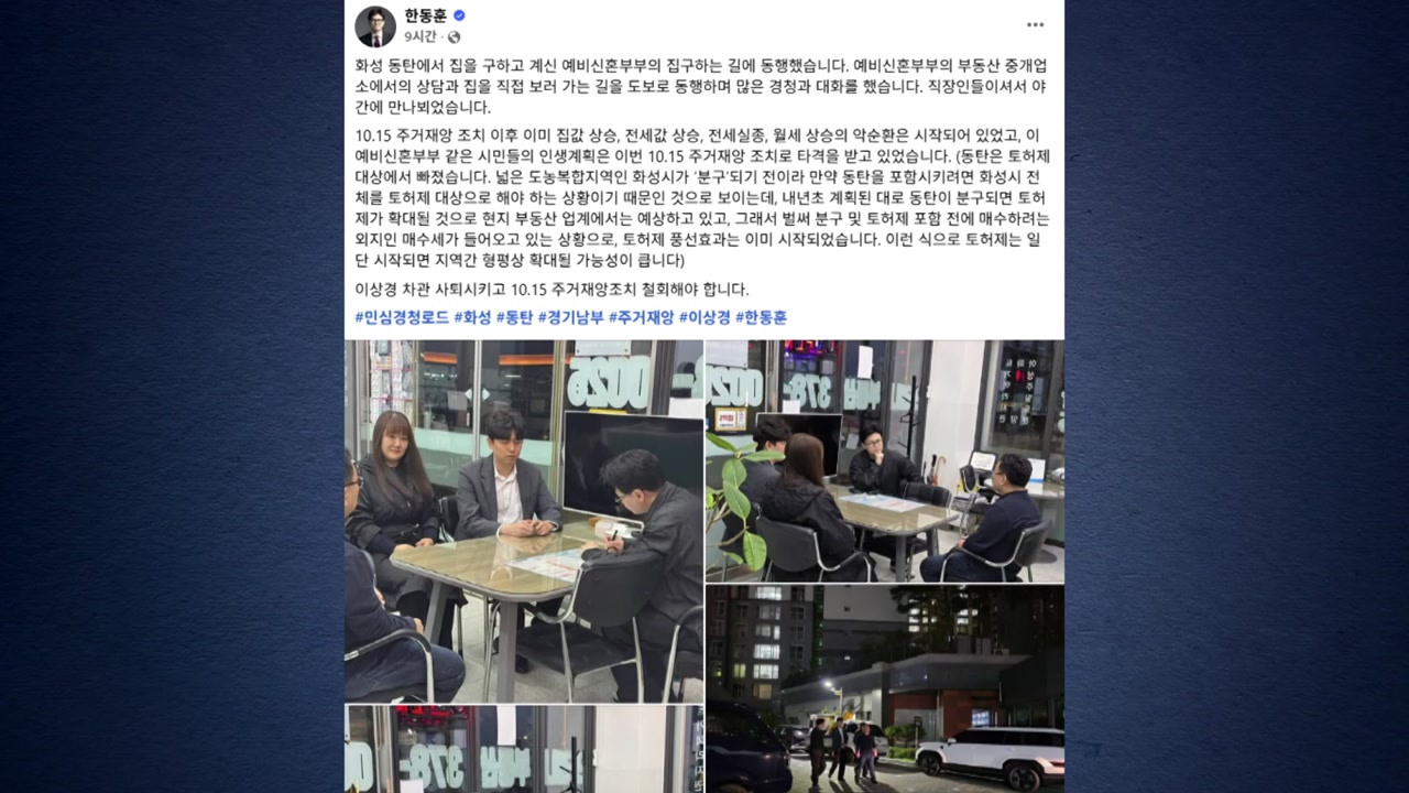 한 전 대표는 오늘(24일) KBS 라디오에서 경기 화성 동탄에 집을 구하는 신혼부부 일정에 동행해보니 동탄은 이번 토지거래허가제 대상에서 빠져 외지인 매수세가 몰리고 있다고 말했습니다.