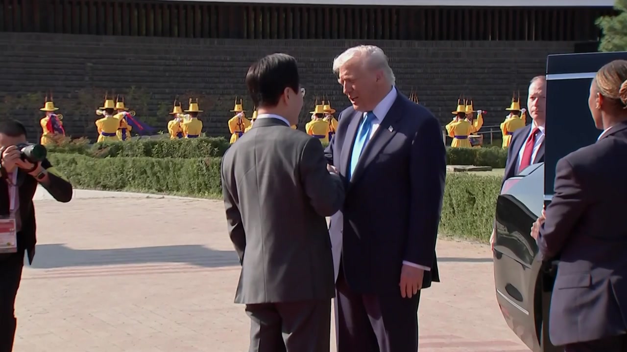 트럼프 대통령, 옷매무새를 다듬고 이재명 대통령과 악수를 하고 있습니다.