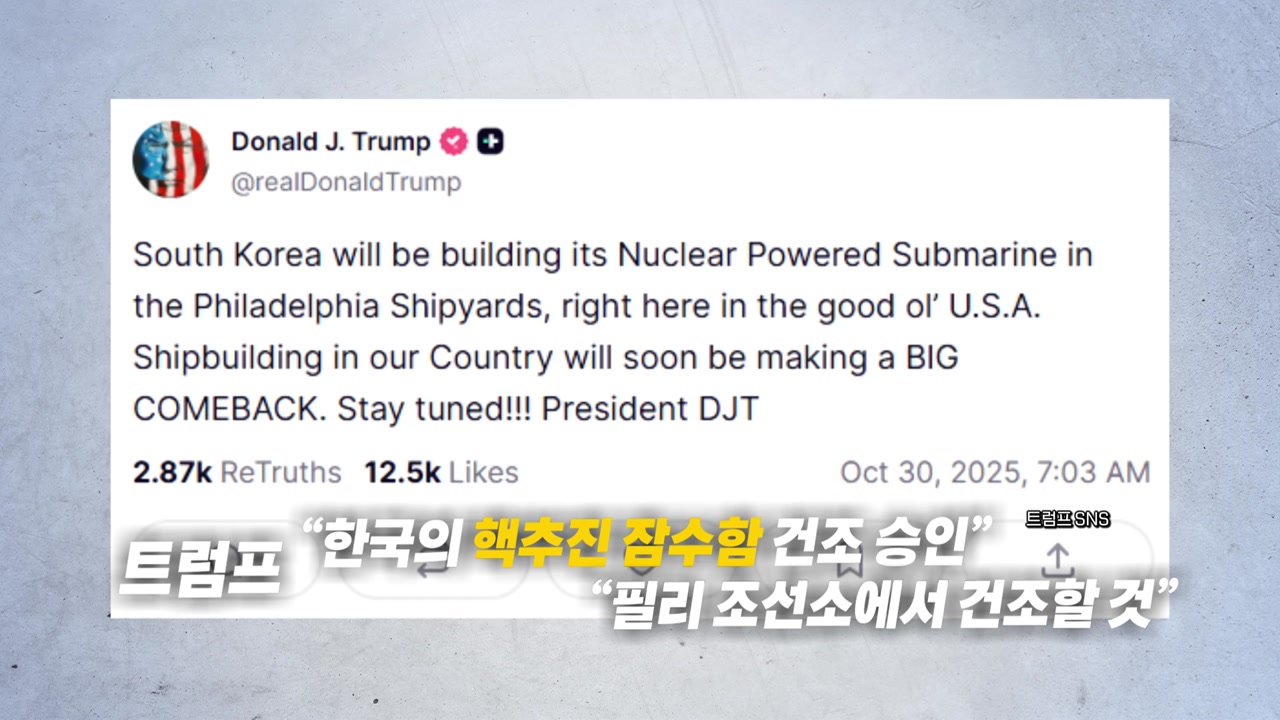 요청 하루 만에, 오늘 아침 트럼프 대통령은 "한국에 핵 추진 잠수함 건조를 승인"했다고 SNS에 직접 밝히며, 미국의 필라델피아 조선소에서 만들어질 것이라고 강조했는데요.