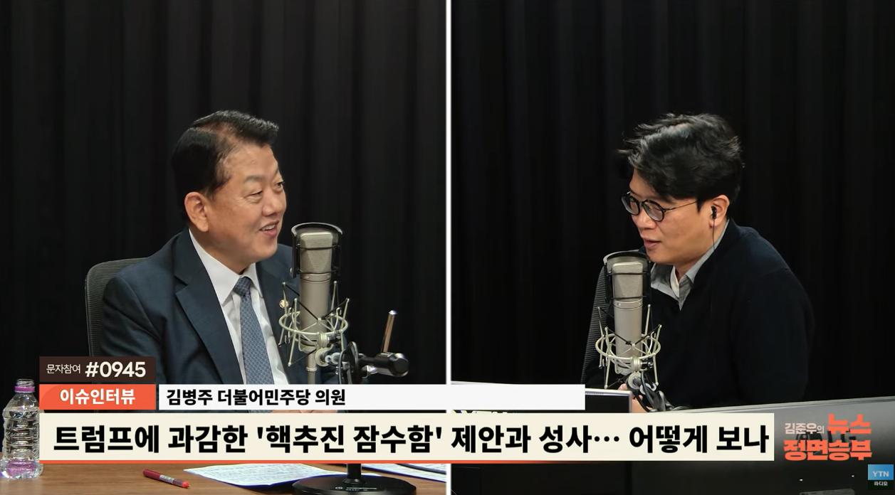 ●김병주: 당선되시고는 교감은 없었지만, 이 문제는 이재명 대통령의 자주 국방으로 가는 데 꼭 필요하다 라고 오래전부터 인식하셨기 때문에, 지난번에 한미 정상회담 한 번 미국 가서 하실 때도 제가 알기로는 이 핵추진 잠수함에 대해서 트럼프 대통령한테 제의를 했던 걸로 알고 있어요. 그래서 이번에 그때 설명이 충분하지 못해서 다시 설명한다 하면서 디젤 그거는 오해할 수가 있잖아요? 핵을 싣은 걸로. 그게 아니라, 디젤 엔진이 자막 능력이 떨어지기 때문에 핵 연료를 주시면은 핵추진 잠수함으로 가겠다 하면서 세부적으로 설명을 하셨잖아요? 그래서 아마 지난번에 이미 여기에 대해서는 의지가 확고하시기 때문에 1차 한미 정상회담 때도 제의했고. 이번에 다시 구체적으로 설명을 하고 여건을 만들어서 했다는 생각이 들고. 이것은 이재명 대통령만 할 수 있는 거다 라는 생각이 들어서, 저는 아침에 이 소식을 듣고 너무 기뻤어요. 저도 오래 전부터 이건 꼭 가져야 된다, 우리 군이 우리 국가가 안전하기 위해서는 그렇게 생각을 했던 건데. 그래서 오늘 국방위 종합감사에 국정감사에서도 주로 이거 위주로 질의를 했습니다.