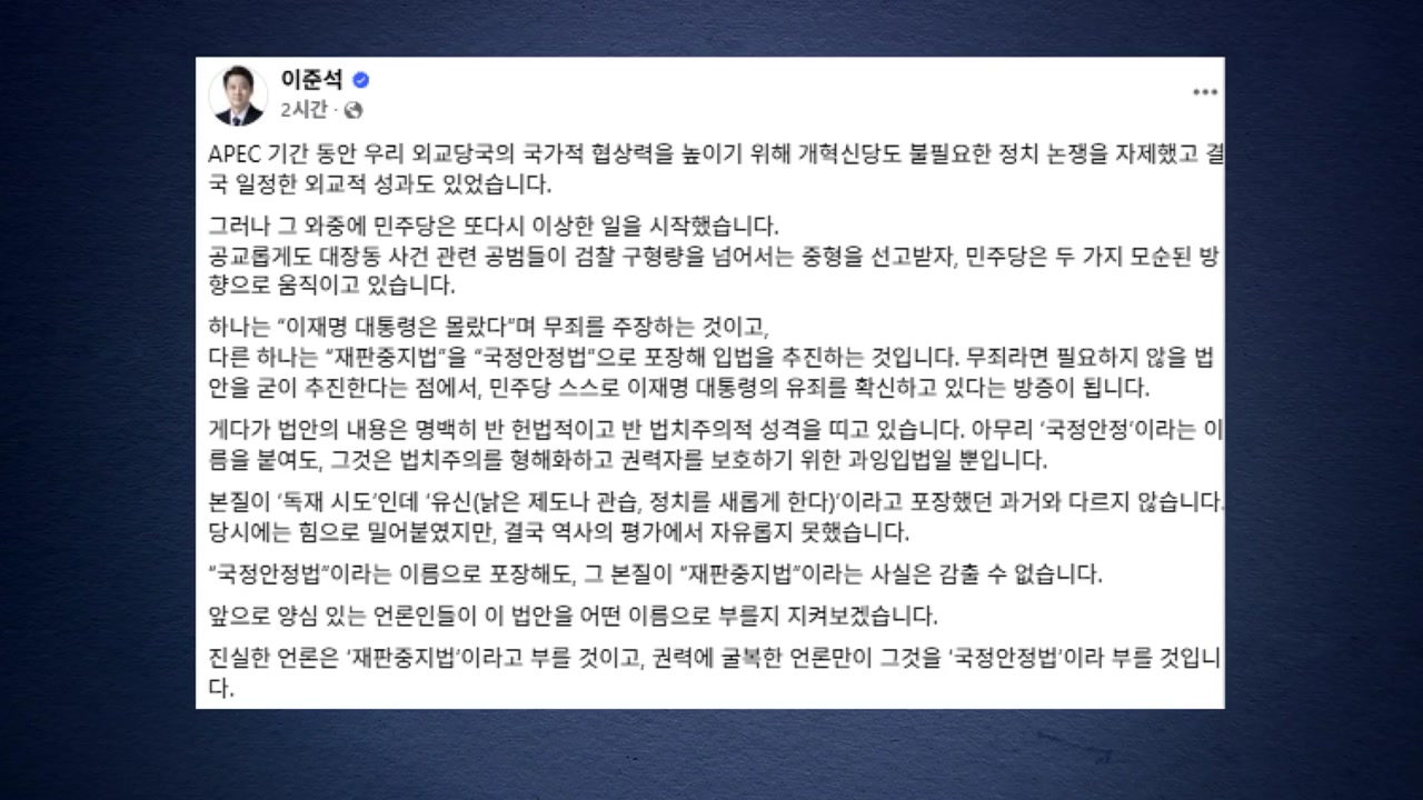 이 대표는 오늘(2일) SNS에 글을 올려 무죄라면 필요하지 않을 법안을 민주당이 굳이 추진하고 있다면서, 이는 법치주의를 형해화하고 권력자를 보호하기 위한 과잉입법일 뿐이라고 강조했습니다.
