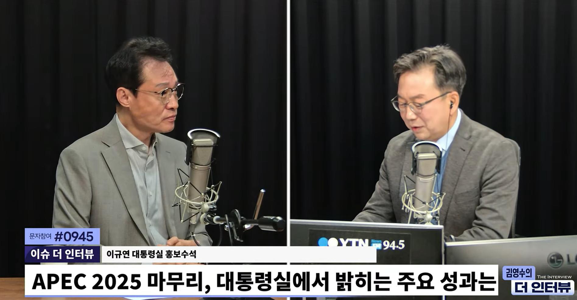 ◆김영수 앵커(이하 김영수): YTN 라디오 김영수의 더 인터뷰 3부 순서 이어가겠습니다. 한미 정상회담, 한중 정상회담, 한일 정상회담까지 이번 APEC 정상회담 준비하고 또 결과 브리핑하고 정말 바쁜 한 주 보낸 분 가운데 한 분을 모셨습니다. 이규연 대통령실 홍보소통수석입니다. 어서오십시오.