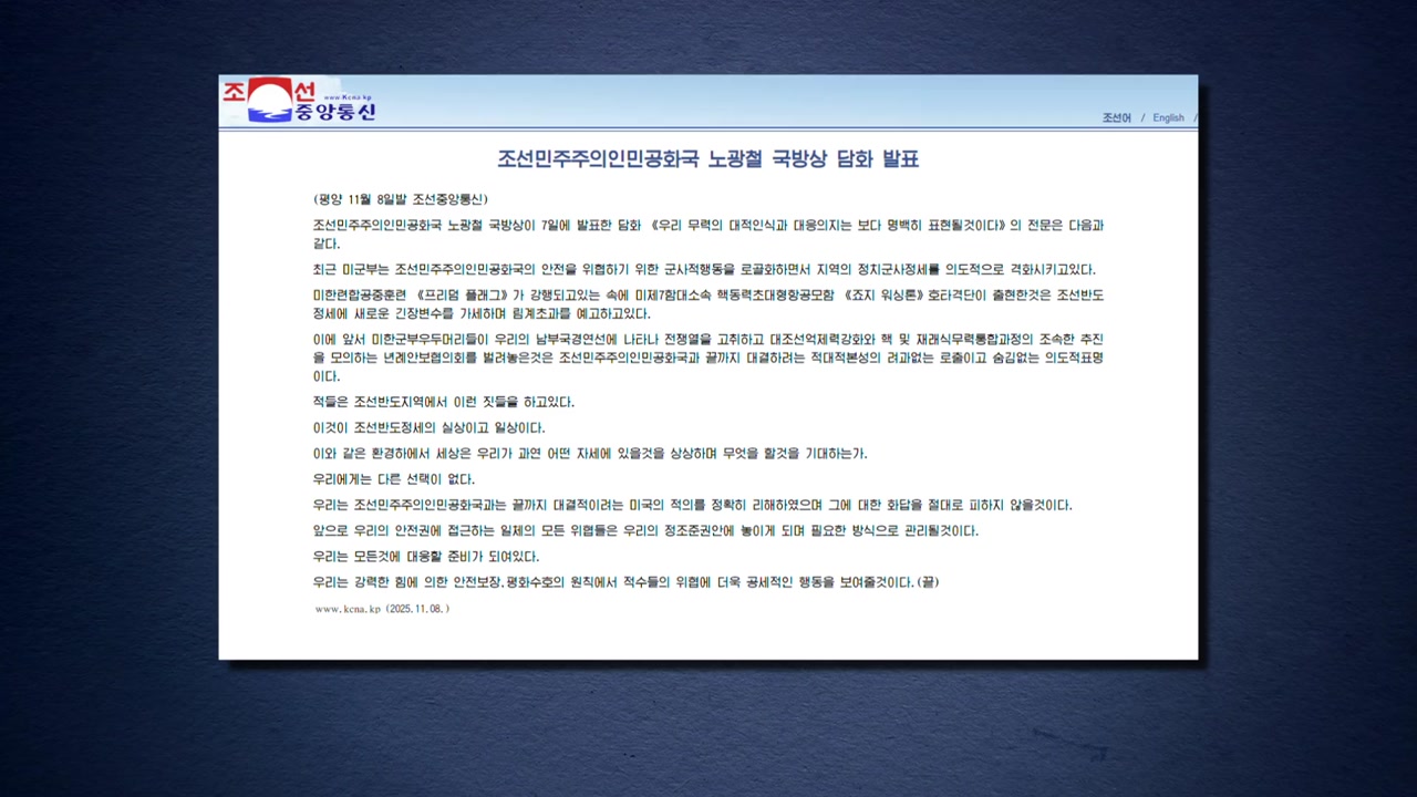 북한이 동해 상으로 탄도미사일을 발사한 날, 우리로 치면 국방장관 격인 노광철 국방상이 대미 담화를 발표했습니다.