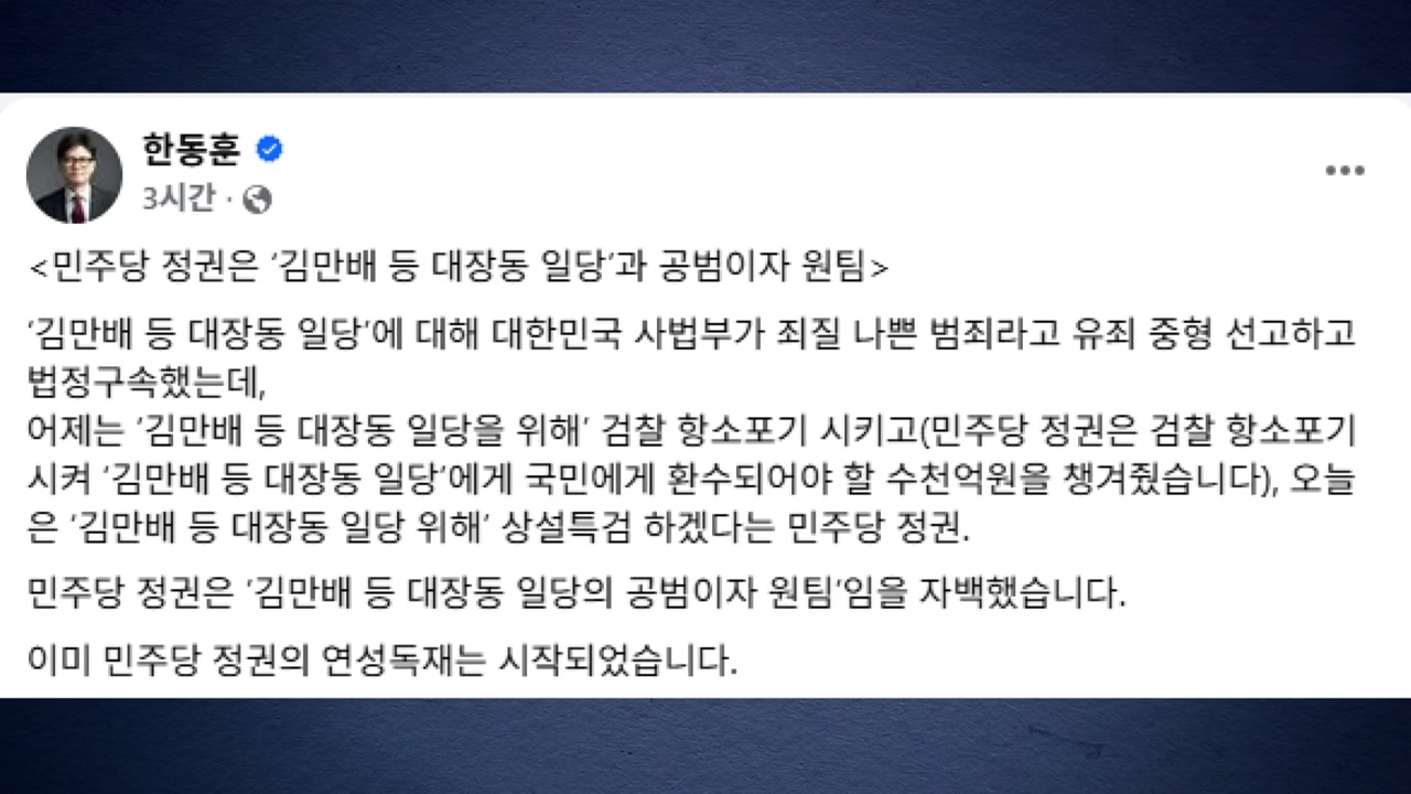 국민의힘 한동훈 전 대표는 검찰의 대장동 사건 1심 항소 포기와 수사팀에 대한 민주당의 상설특검 검토 입장을 두고, 민주당 정권이 대장동 일당의 공범이자 원팀임을 자백한 거라고 말했습니다.