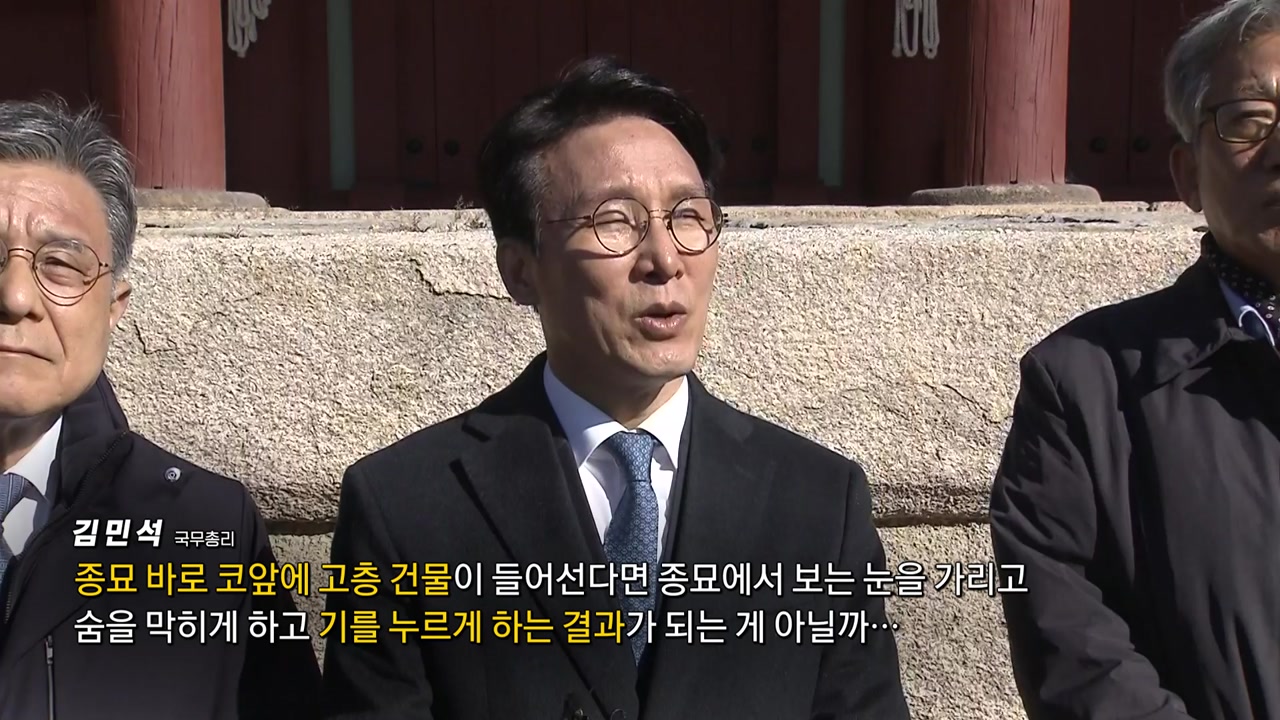[김민석 / 국무총리 : 종묘 바로 코앞에 고층 건물이 들어선다면 종묘에서 보는 눈을 가리고 숨을 막히게 하고 기를 누르게 하는 결과가 되는 게 아닐까…. 김건희 씨가 종묘를 마구 드나든 것 때문에 국민께서 아마 모욕감을 느끼셨을 텐데 지금 이 논란으로 국민의 걱정이 크신 것 같습니다.]