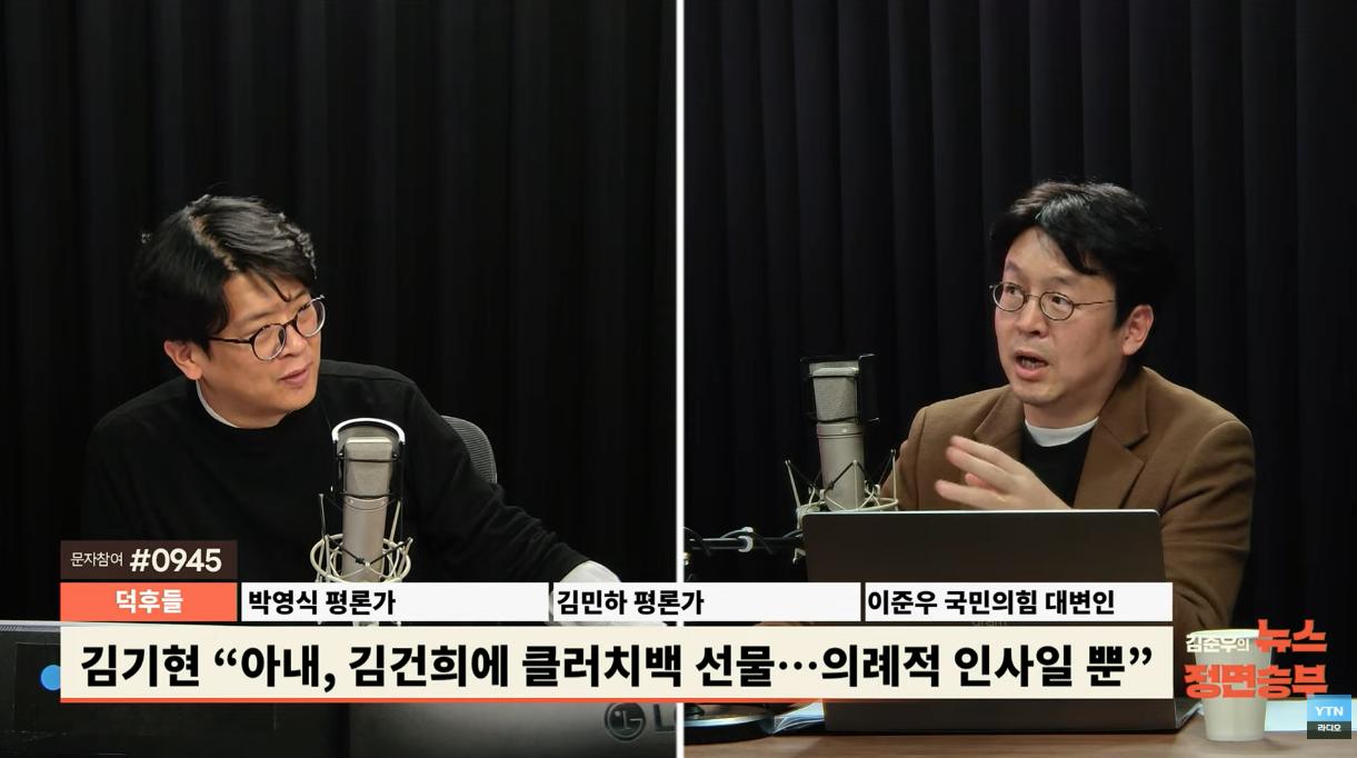 □이준우: 제가 이제 좀 이거 물어봤어요. 김기현 이제 측근들 의원 측근들한테 물어봤었는데 진짜 그 당 대표 당선되고 나서 이제 감사한 마음으로 이제 이제 당을 잘 이끌겠다 이제 그런 의미로 선물을 준 거고요. 또 이제 민주당이 하는 공격 중에 이런 게 있습니다. 그때 김기현 이제 당시 당 대표가 상당히 이제 낮은 지지율을 얻고 있었는데 나중에 이제 친윤 세력의 힘을 얻어서 당 대표가 된 것 아니냐라고 얘기했거든요. 그런데 이게 당 대표 선거가 3월에 있었어요. 그런데 1월달 당시에 YTN에서 했던 여론조사가 있었습니다. m퍼블릭인가 거기서 했던 건데 거기에 보면 김기현 대표가 1등으로 나와요. 그리고 나경원 의원이 2등 그런데 이 두 사람 간의 차 퍼센트 차이가 몇 퍼센트 포인트밖에 차이가 안 나요? 굉장히 박빙이었습니다. 그리고 그쯤에 또 다른 여론조사에서는 나경원이 1등이고 김기현 의원이 2등이고 그다음에 유승민이 3등, 안철수가 4등 이런 결과가 나왔었어요. 그러니까 전당대회 상당히 2-3개월 전부터 김기현 의원이 상당히 자력으로 1-2위를 다투고 있는 상황이었기 때문에 어떻게 당 대표에 당선되도록 대통령에서 도와줘 가지고 거기에 답례로 선물했다고 보기에는 좀 무리가 있다라는 생각이 들고 또 이제 그 가방의 가격도 좀 이제 말씀드리자면 일부에서는 뭐 몇 천만 원짜리 값 아니냐라고 생각하는데 그러지는 않더라고요. 이게 100만 원대 초반에서 중반 요 사이 가격대로 가더라고요. 물론 이제 100만 원이라는 자체가 더 큰 돈이긴 합니다. 하긴 한데 일부에서 이제 좀 약간 선전 이제 선동하듯이 왜곡돼 가지고 몇천만 원짜리 고가의 가방을 준 거 아니냐라고 하는데 그건 아니다 그것까지 말씀드리겠습니다.