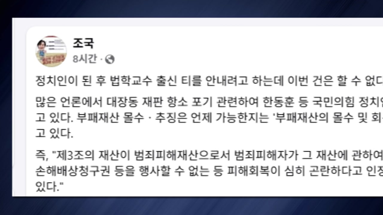 조 전 위원장은 오늘(11일) 자신의 SNS에, 이 사건의 피해자는 국가가 아니라 성남시, 정확히는 성남도시개발공사라면서 부패재산몰수법에 따라 성남시가 민사소송을 제기할 수 없는 경우에만 몰수·추징이 가능하다고 설명했습니다.