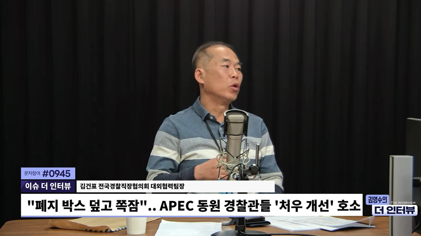 ◆ 김영수 : 청취자 여러분들의 메시지가 도착하고 있는데, 2402번님이 ‘진짜 듣는데 눈물이 납니다. 얼마 전에 거리에서 취객과 시비 붙어서 정말 곤란했는데, 그때 경찰들이 와서 안전하게 조치해 주셔서 너무 감사했습니다. 경찰 분들 처우 반드시 개선해 주세요.’ 라는 글이 올라왔고요. 또 0431번 분은 ‘얼마 전 뉴스에서 이분 인터뷰 봤다. 오늘 나오셨는데 경찰도 유치원 교사 등이 가장 좋은 대우 받아야 한다고 생각합니다. 이분들이 현장에서 고생도 많이 하시는데, 앞에서 성과만 가져가는 분들 반드시 반성을 해야 합니다.’ 우리 국민들 다 알고 계십니다. 그 큰 노고 묵묵히 APEC을 지원했던 우리 경찰들의 모습을 보면서 많이 응원했는데, 뒤에서 이렇게 어려움을 겪고 있었다고 생각하니까 정말 안타깝기도 하고요. 빨리 후속 지원 대책이 마련돼야 할 것 같습니다. 저희가 경찰청의 입장, 경찰청장 직무대행께도 인터뷰를 요청을 했는데요. APEC 근무 여건이 미흡했던 걸 인정하고, 재발 방지책을 강구하고 있다는 그런 입장을 밝혔고, 추가 대응 계획은 없다고 했습니다. 그래서 기존 입장으로 가늠한다면서 인터뷰를 하지 않고 계셔서 경찰 수뇌부 입장을 듣지 못했습니다. 그런데 하실 말씀이 있으면 언제든지 나와 주시면 저희가 또 경찰청 지휘부의 입장도 들어보겠습니다. 경찰 직장협의회를 맡고 계시니까 현직에 근무하고 계시잖아요. 불이익을 받지 않을까 또 걱정도 되네요.