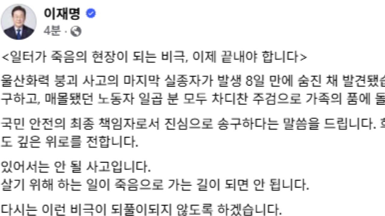 이재명 대통령은 울산 화력발전소 붕괴 사고의 실종자 모두가 숨진 채 수습된 것에 대해, 국민 안전의 최종 책임자로서 진심으로 송구하다고 밝혔습니다.
