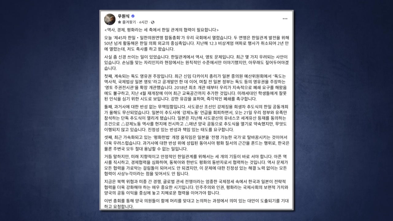 우 의장은 오늘(16일) 국회 한·일 의원연맹 합동총회 참석 뒤 자신의 SNS에, 다카이치 총리 발언은 미래세대인 학생들에게 잘못된 인식을 심기 위한 시도로 보인다며 이같이 적었습니다.