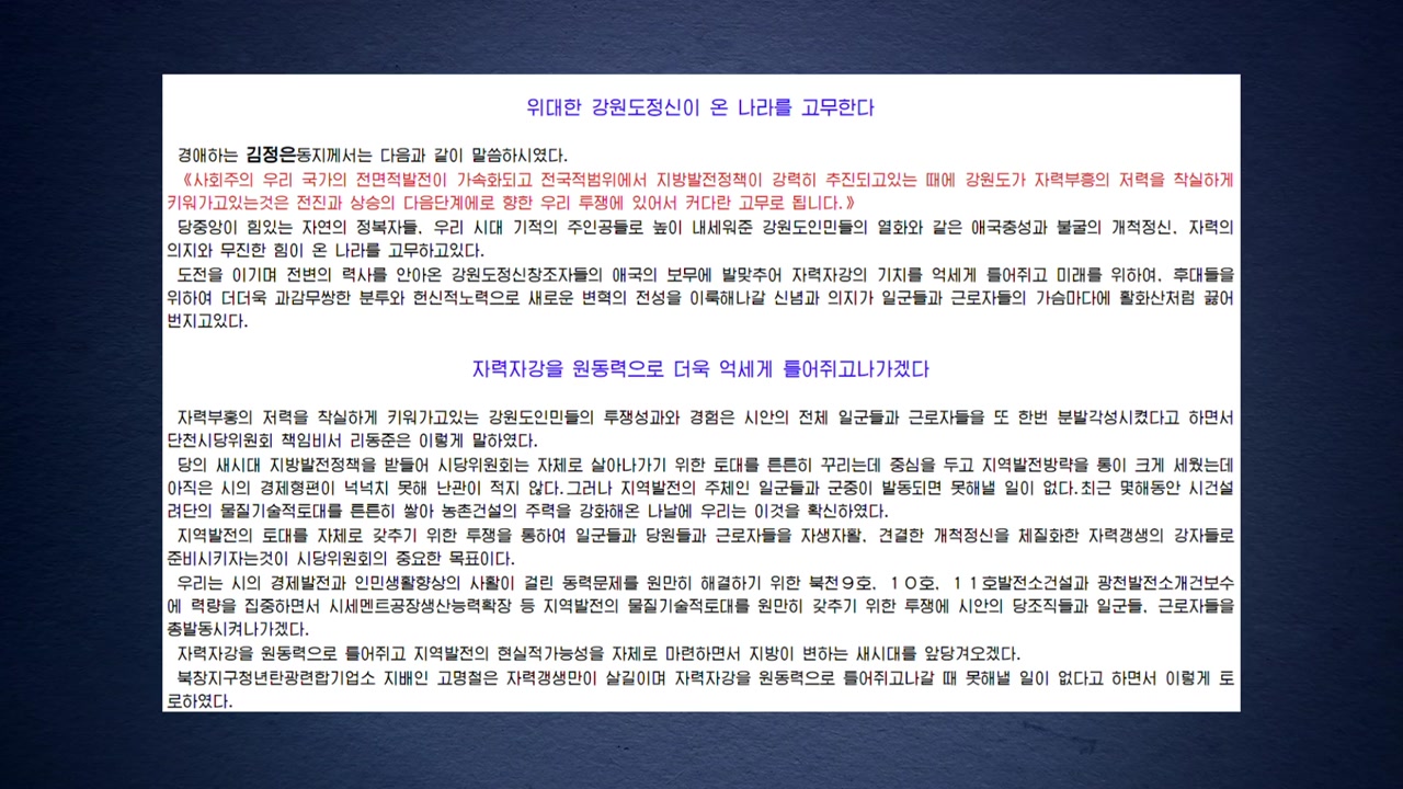 노동신문은 '위대한 강원도 정신이 온 나라를 고무한다'는 제목의 1면 기사에서 강원도 회양군민발전소 준공을 지켜본 주민들의 반향을 전하며 이들이 자력부흥의 저력을 착실하게 키워가고 있다고 치켜세웠습니다.