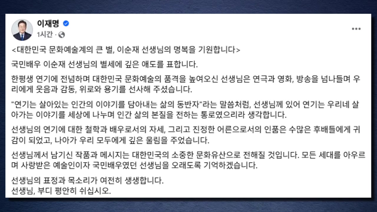 이 대통령은 오늘(25일) SNS에 대한민국 문화예술계의 큰 별, 이순재 선생님의 명복을 기원한다며 이같이 적었습니다.