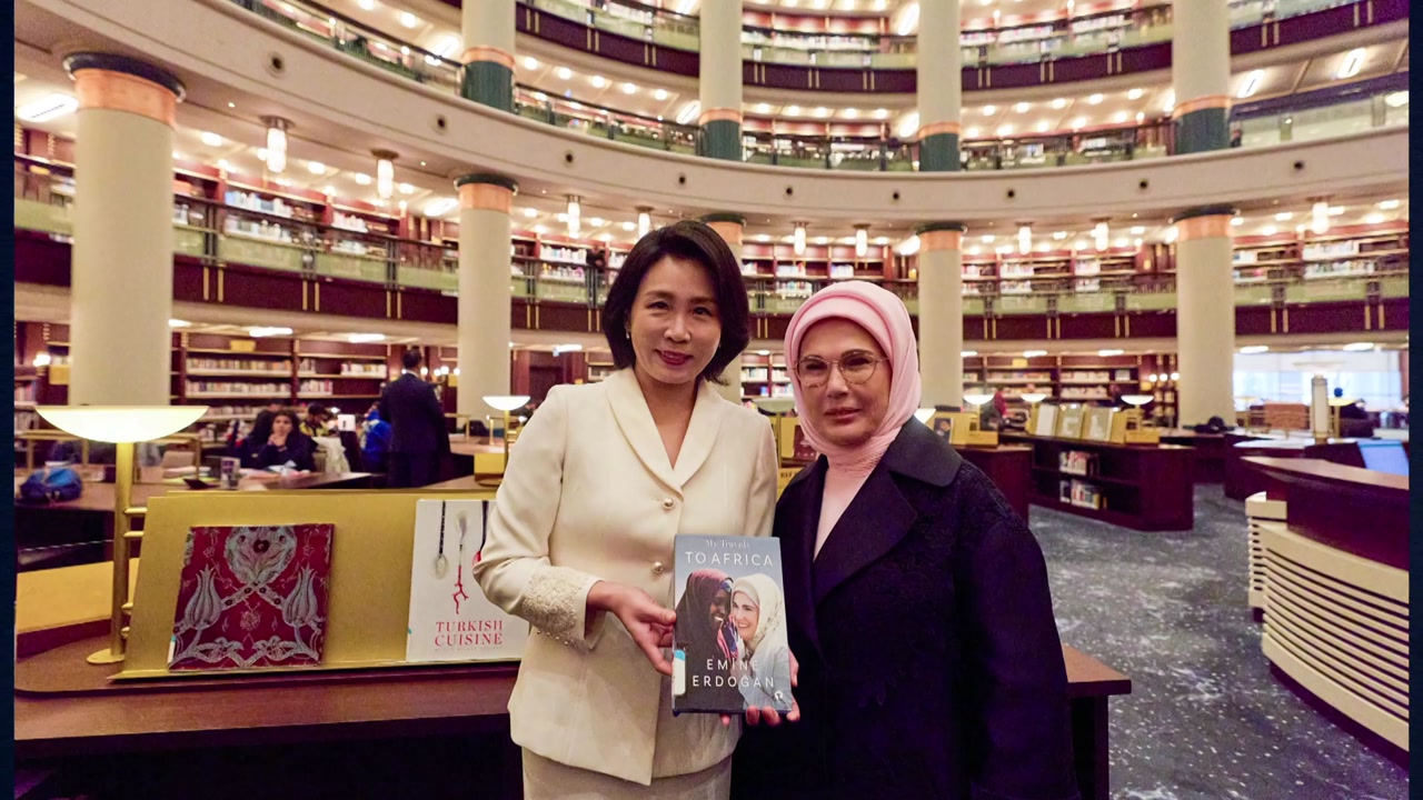 이재명 대통령과 튀르키예를 국빈 방문하고 있는 부인 김혜경 여사는 레제프 타이이프 에르도안 대통령의 부인, 에미네 에르도안 여사와 현지 도서관 한국 코너를 방문했습니다.