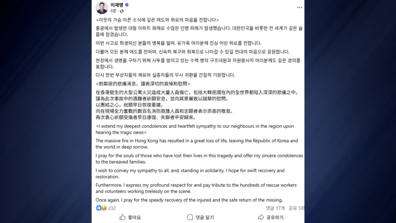 이재명 대통령은 홍콩 고층 아파트단지 화재 참사와 관련해, 이웃의 가슴 아픈 소식에 깊은 애도와 위로의 마음을 전한다고 밝혔습니다.