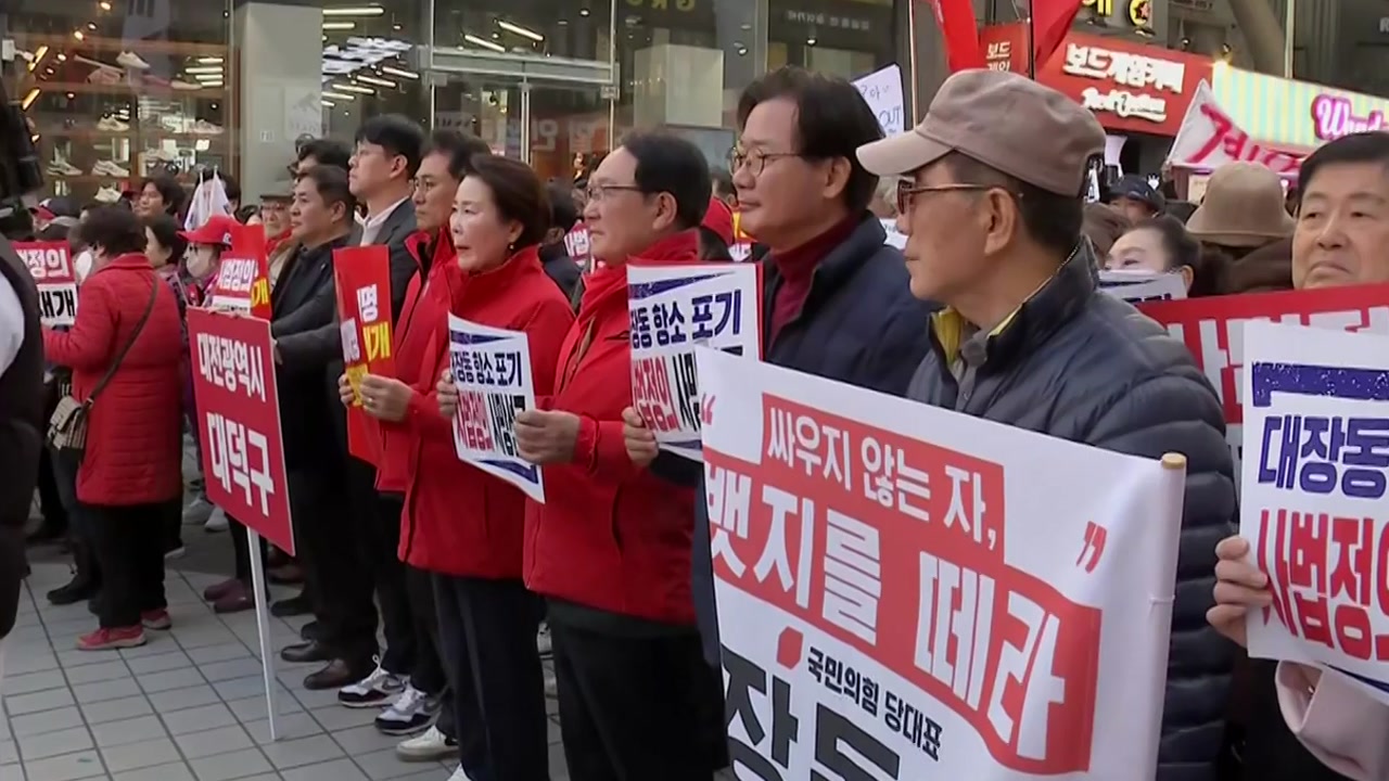 12·3 비상계엄 사태 1년을 앞두고국민의힘이 장외집회를 이어가고 있습니다. 하지만 지도부 내에서도대여 투쟁과 사과 요구가 동시에 쏟아지면서 균열이 생기고 있는 모습입니다. 관련 내용,최창렬 용인대 특임교수,김철현 전 국회정책연구위원과 짚어보겠습니다. 어서 오십시오. 국민의힘 의원들은 장외집회에 나서고 있는데요. 현장에서 나온 발언부터 듣고 오겠습니다. 비상계엄을 둘러싸고 지도부 사이에서도 이견이 있는 모습이었습니다. 우선 장동혁 대표가 전날 대구에서도 그렇고 대전에서 있었던 장외집회에서도 계엄 원인이 민주당의 의회 폭거 때문이라고 했거든요. 어떻게 들으셨습니까?