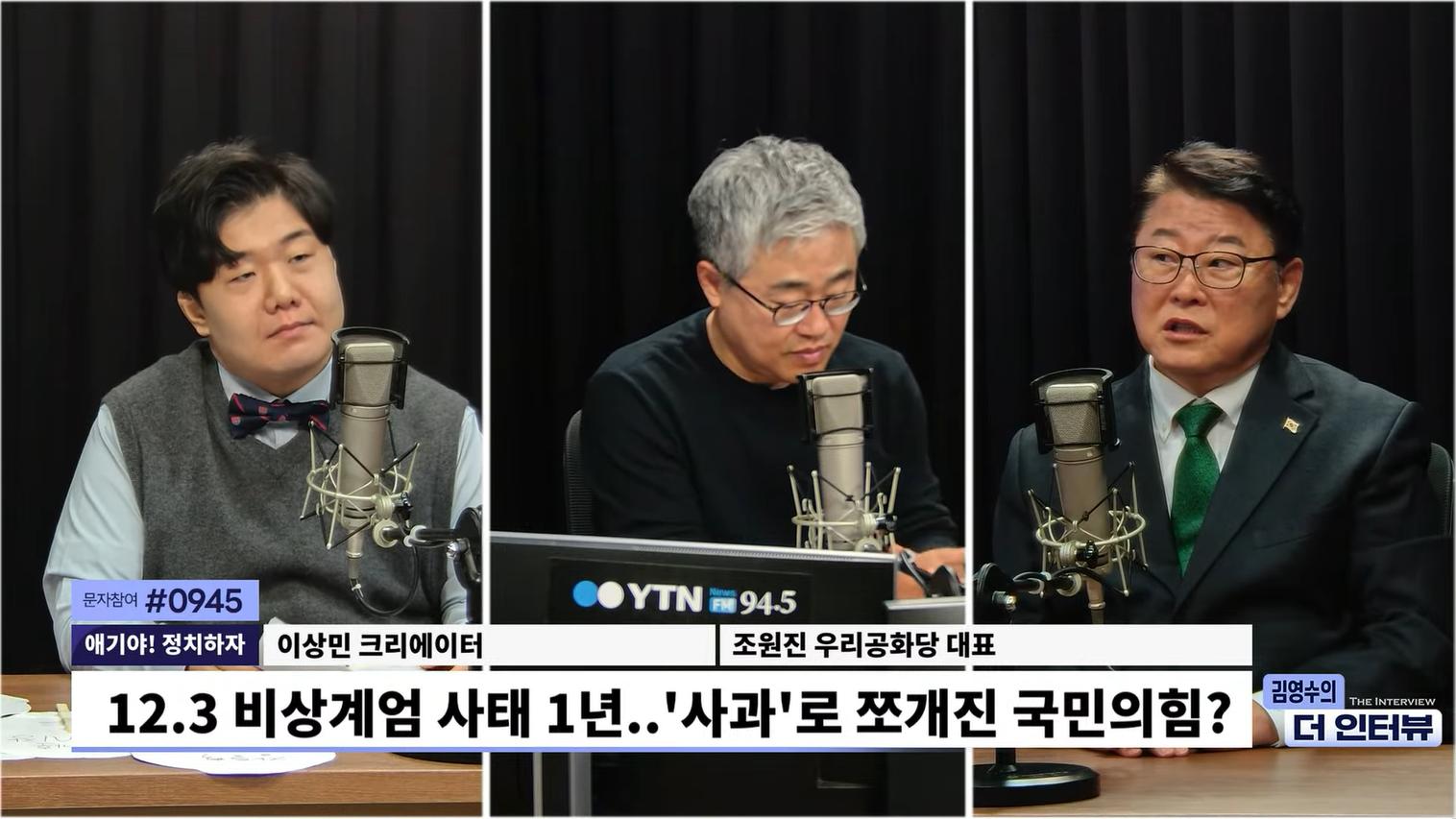 □ 조원진 : 또다시 사과를 했을 때 정치적으로 보면 배현진 의원이 뭐라 했더라고? 그런데 지금 민주당이나 이재명 정권이 하는 게 정상적인가? 사과라는 게 그냥 국민의힘의 사과로 끝나는 게 아니고 더 가면 민주당의 행태를 인정하는 꼴이 된다. 지금의 내란 프레임을 가지고 국민들의 생각을 멈춰놓고 소위 입법 독주를 통해서 입법, 사법, 행정을 다 장악하는 입장으로 가고 있잖아요. 그런 부분이 맞물려 있지 사과 하나의 사건으로 마무리되는 거 아니다 이런 입장입니다.
