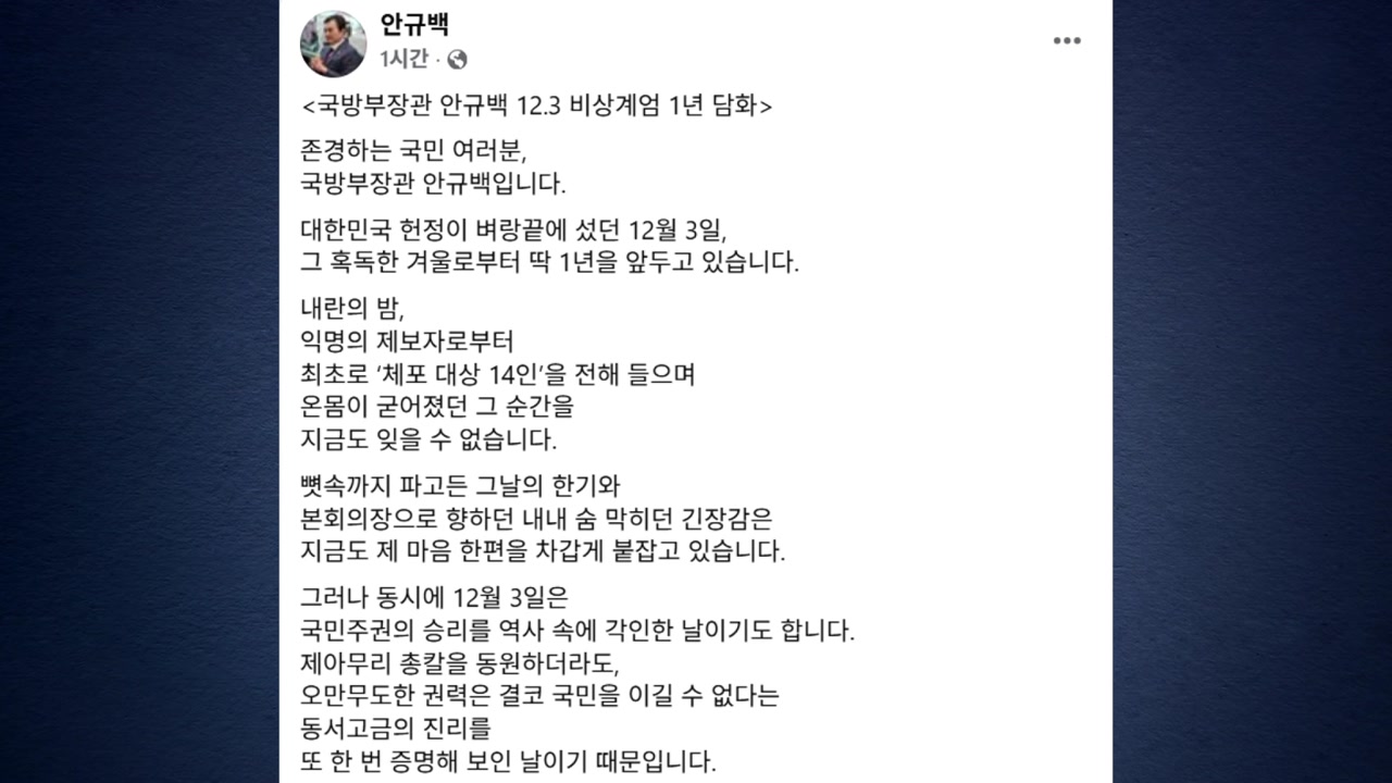 안규백 국방부 장관이 '12·3 비상계엄' 1년을 하루 앞두고 당시 군 병력의 국회 진입 등을 공식 사과하며 군 쇄신을 이어가겠다는 의지를 밝혔습니다.